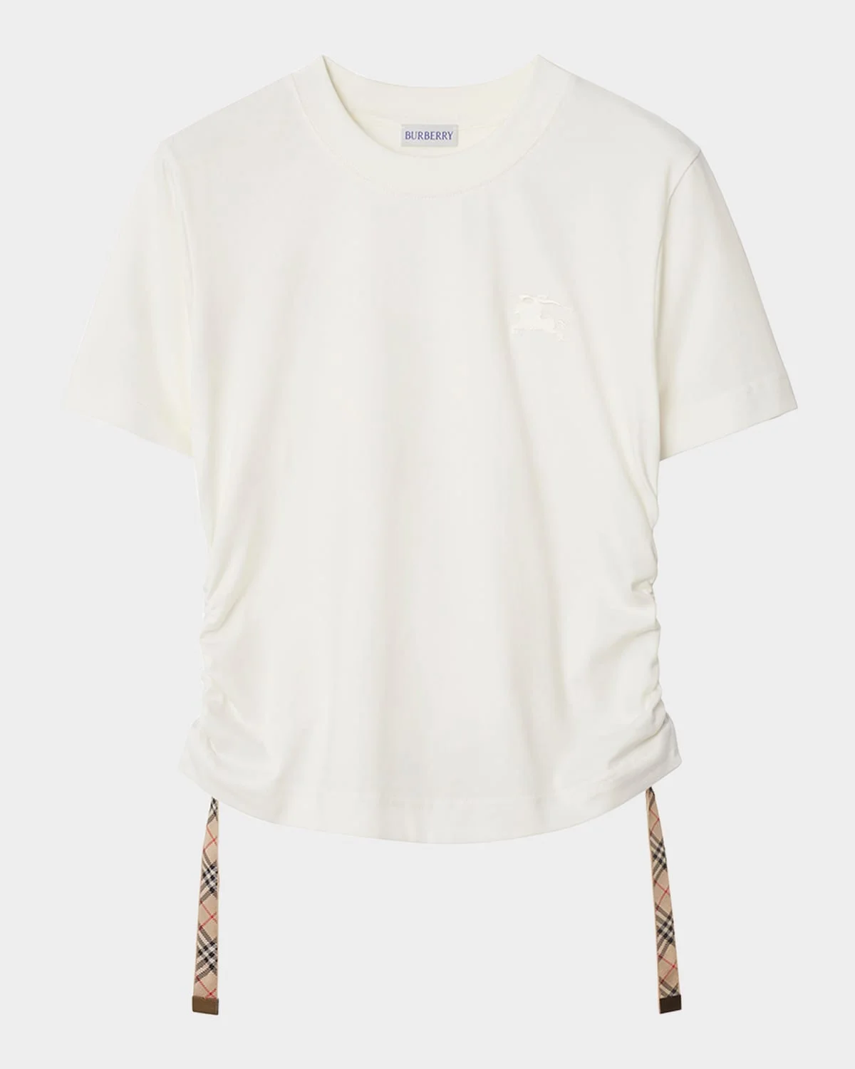 - Burberry T-shirt featuring an EKD embroidered chest and side ruching with signature check ties - Crew neckline - Short sleeves - Relaxed fit - Pullover style - Cotton/elastane/polyester - Made in Portugal