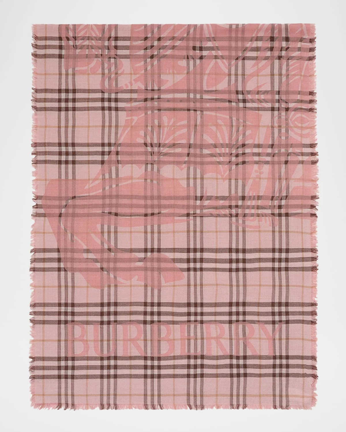 Designed for year-round wear, this wide rectangular scarf from Burberry features a jacquard-woven & nbsp;Equestrian Knight Design motif, logo, and check pattern. Approx. 78.8"L x 25.6"W Eyelash fringing at edges May be styled multiple ways Wool/silk Dry clean Made in Italy