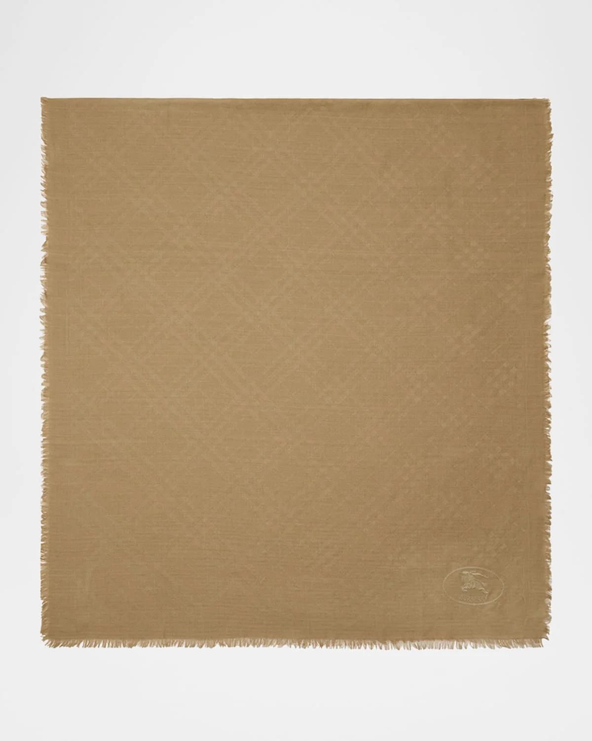 - Burberry lightweight scarf, jacquard woven with a tonal check pattern - Approx. 35.4"W x 78.7"L - Embroidered with the Knight Stamp, an archival motif from the 1980s - Eyelash fringing on the edges - Wool/silk - Professional cleaning recommended - Made in Italy