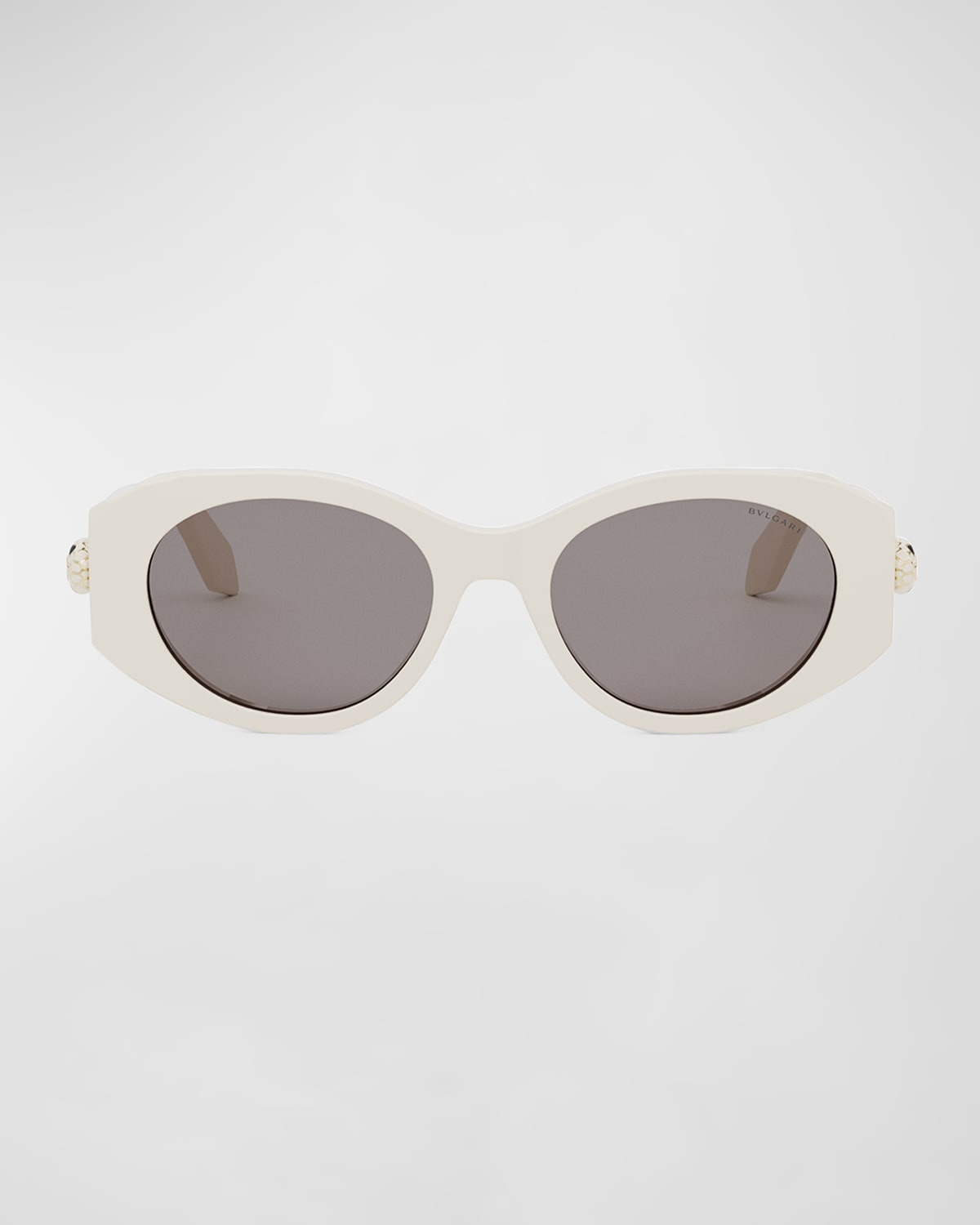 - BVLGARI "BV40007IW" oval sunglasses in acetate, metal, and nylon/polyamide - Iconic snake head positioned on shorter temples with an eye-catching front shape - Lens/bridge/temple (in mm): 63-15-140 - Saddle nose bridge - Logo on temples - Wide, tapered arms - Hand wash - 100% UVA/UVB protection - Made in Italy - Proposition 65 warning for California residents