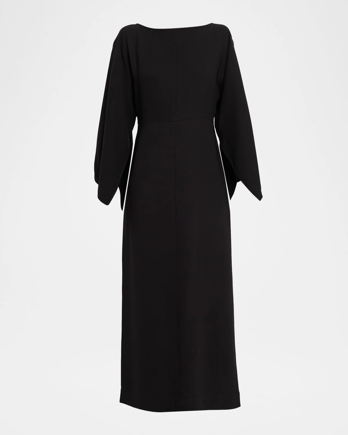 By Malene Birger "Hella" refined evening dress features a slim fit and wide sleeves with slits Bateau neckline Long sleeves Back slit Full length Straight silhouette Back zip closure Viscose Delicate machine wash Imported