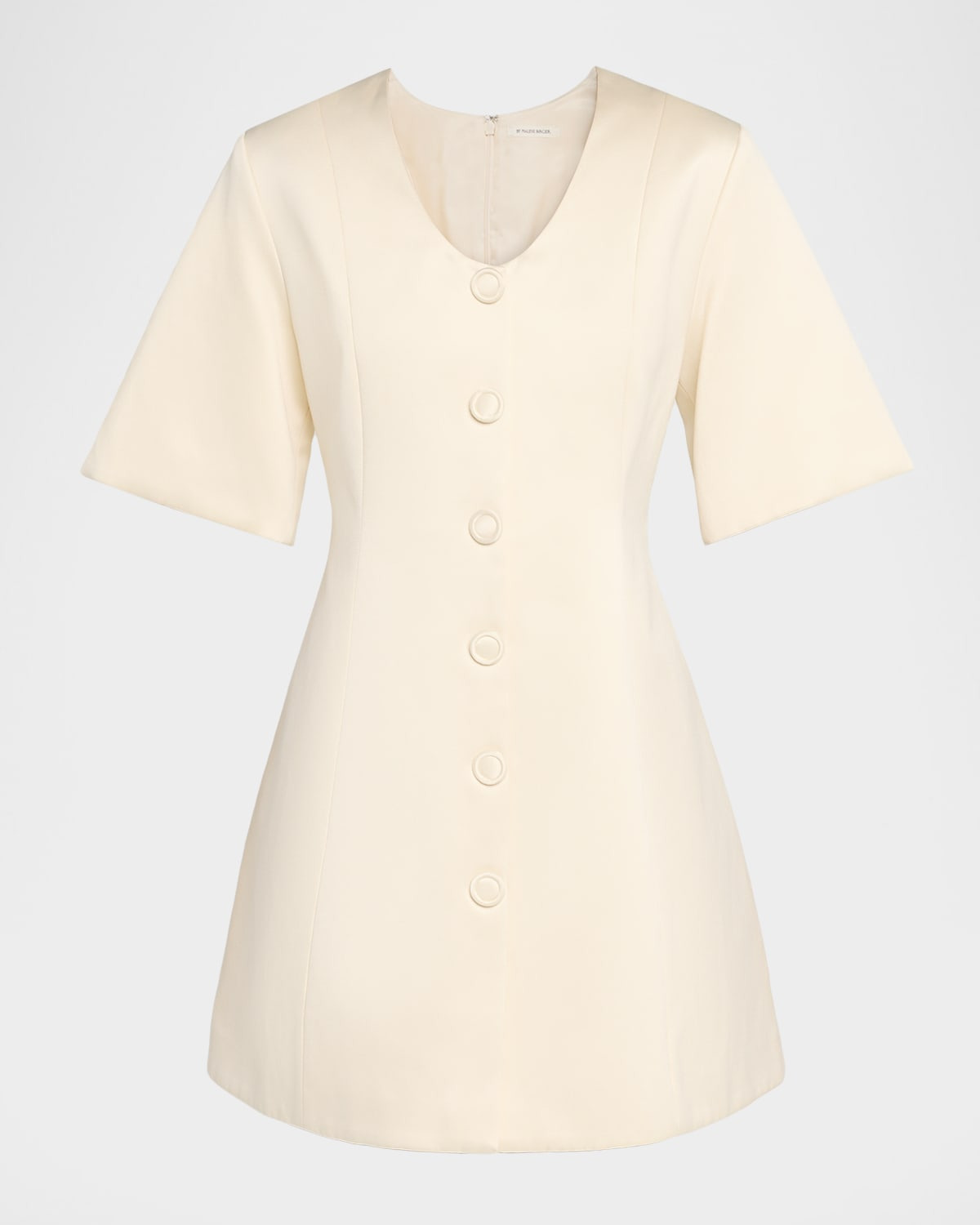 - By Malene Birger "Josephine" versatile mini dress adorned with decorative self-covered faux buttons - Scoop neckline - Elbow sleeves - Princess seams - Hem falls above the knee - A-line silhouette - Invisible back zipper - Polyester/cotton - Dry clean - Imported