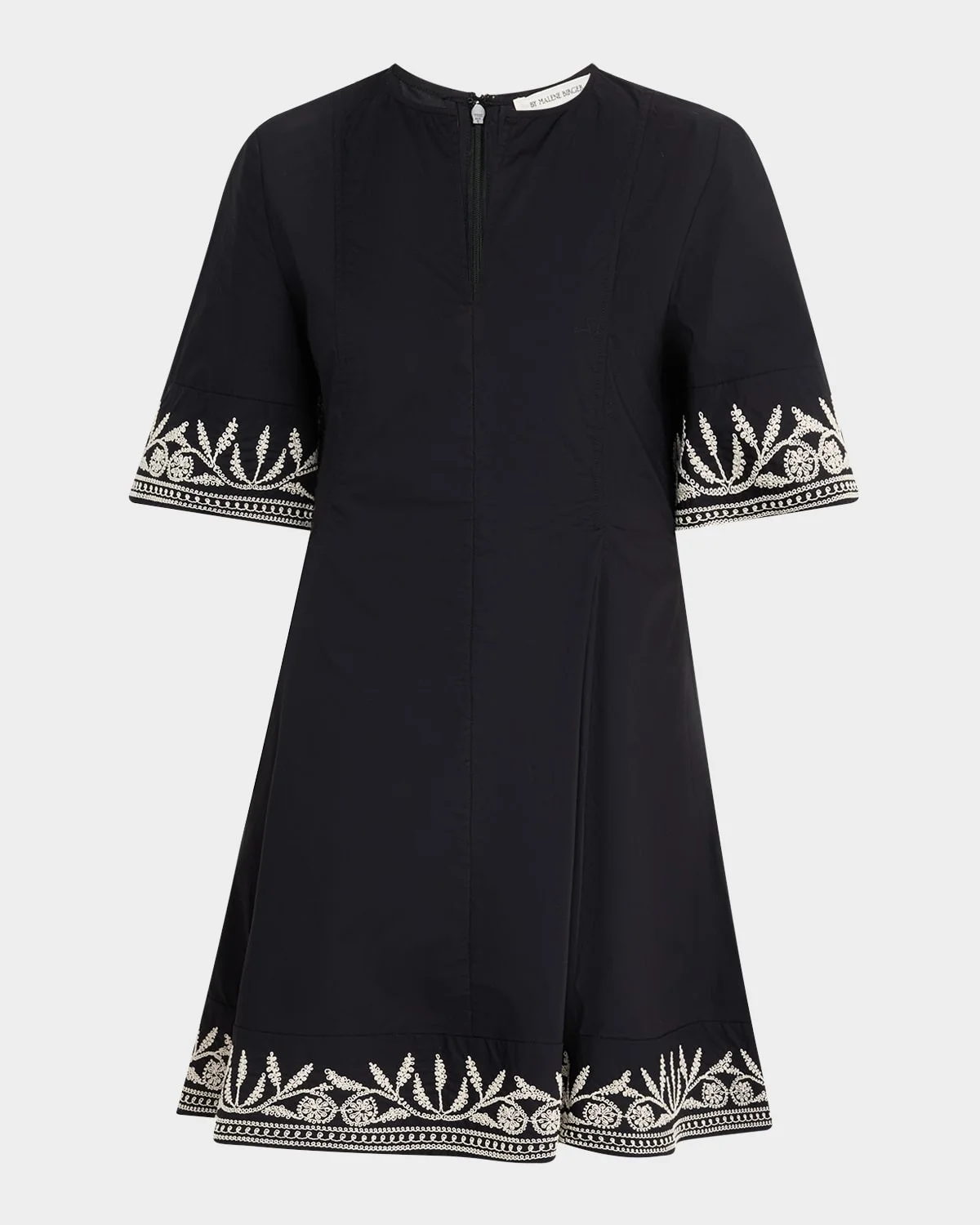 - By Malene Birger "Mary" mini dress in cotton poplin brightened with embroidery - V neckline - Wide elbow sleeves - Hem falls above the knee - A-line silhouette - Invisible back zipper - Organic cotton - Dry clean - Imported