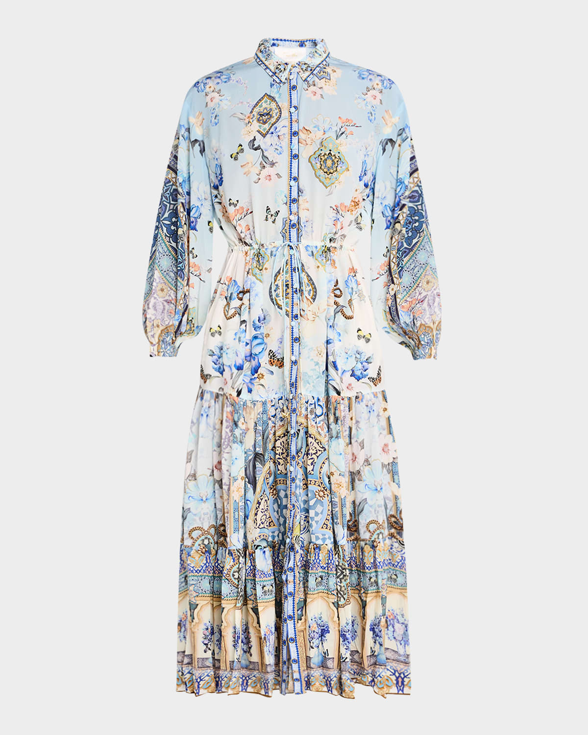 - Camilla tiered shirtdress featured in Al Manial Palace Memoirs print with crystal embellishments and tassel tie ends - Soft tailored collar; button front - Dropped shoulders - Long blouson sleeves; gathered cuffs - Self-tie belted waist - Hem falls below the knee - Relaxed fit - Flowy tiered skirt - Silk - Imported