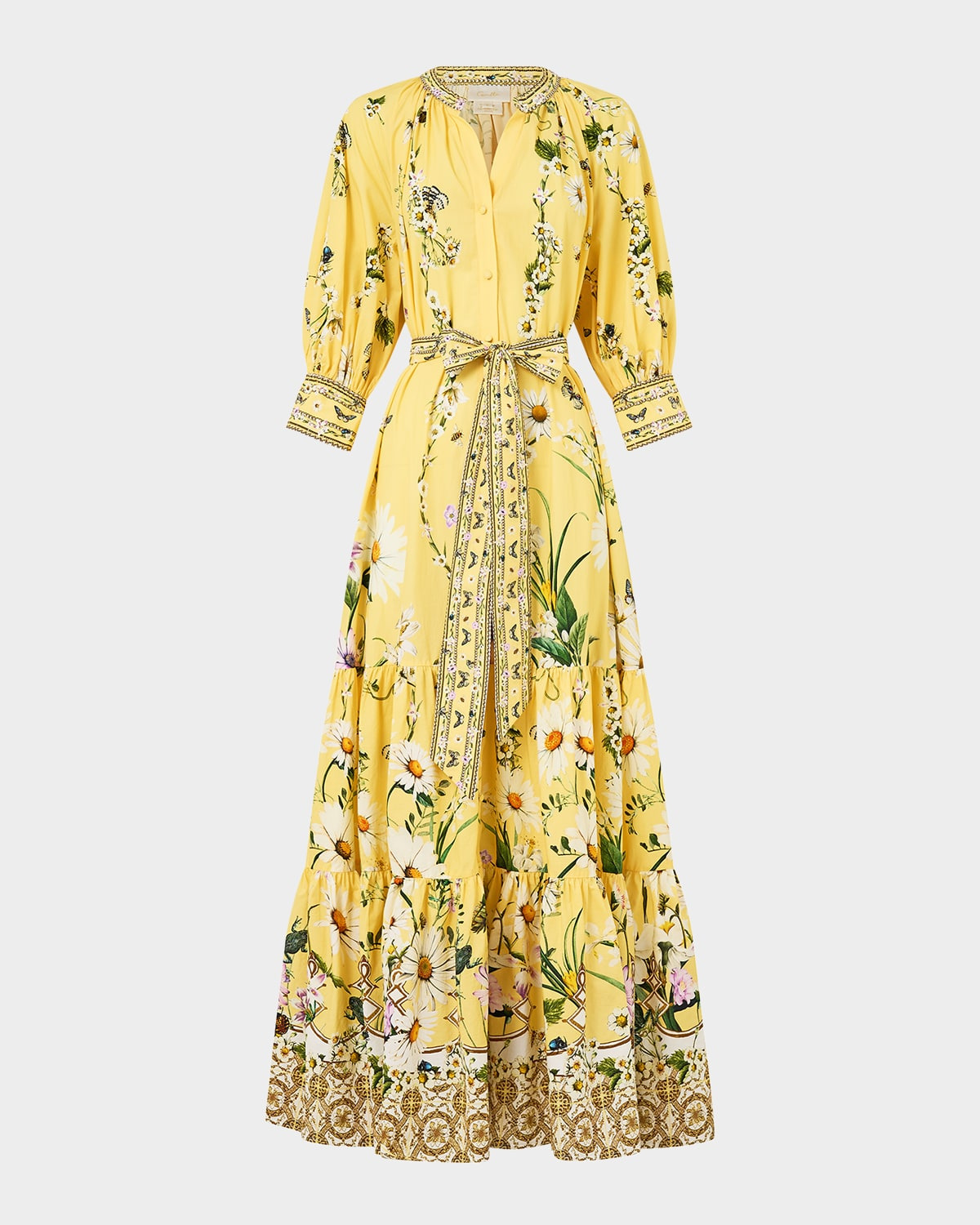 - Camilla lovingly handcrafted tiered shirtdress in a daisy and multi-botanical print - Collared V neckline; button front - 3/4 blouson sleeves; button cuffs - Self-tie sash belt - Relaxed fit - Full length - Organic cotton - Imported