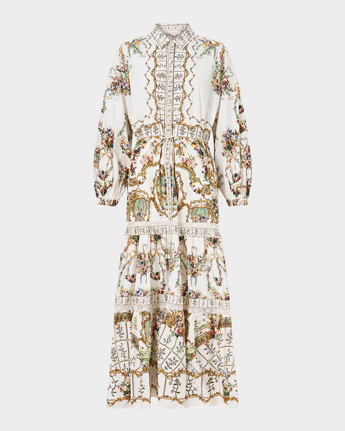 - An elevated take on the classic silhouette, this handcrafted shirtdress by Camilla boasts a Palace of Queluz-inspired floral print with crystal embellishments - Shirt collar; concealed button front - Long blouson sleeves; elastic cuffs - Self-tie belt at waist - Flowy tiered skirt - Full length - Organic cotton - Imported