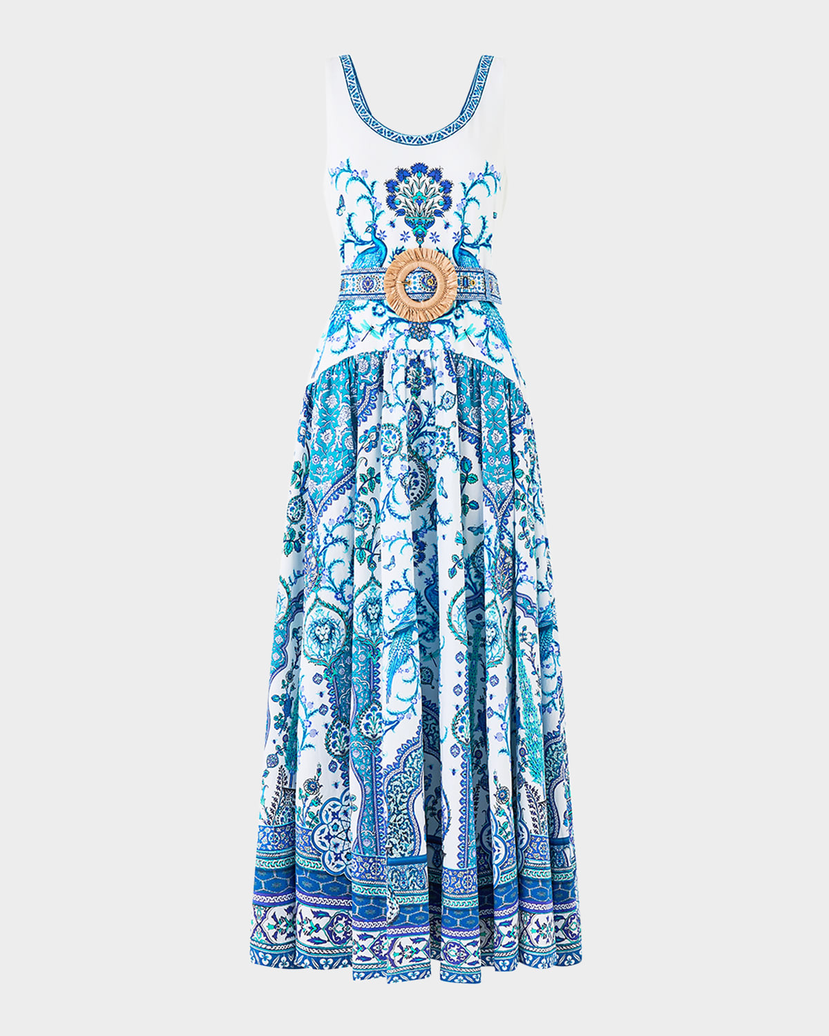 Complete with a contrasting raffia belt, this jersey dress by Camilla features a bold multipattern print finished with crystalembellished accents Scoop neckline Sleeveless Removable belt Drop waist Full length Elasticated back panel Cotton Dry clean Imported