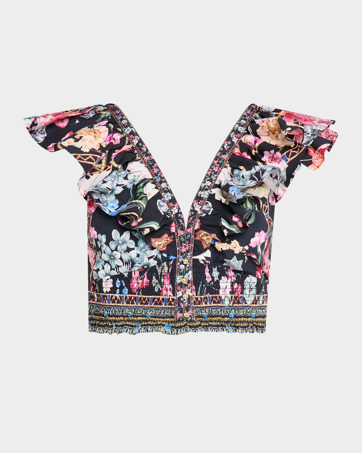 - Camilla lovingly handcrafted blouse featured in Midnight in Monserrate print with crystal embellishments - V neckline; partial button front - Short flutter sleeves - Slim fit - Cropped smocked hem - Mid-back self-ties - Organic cotton - Imported