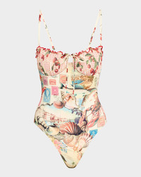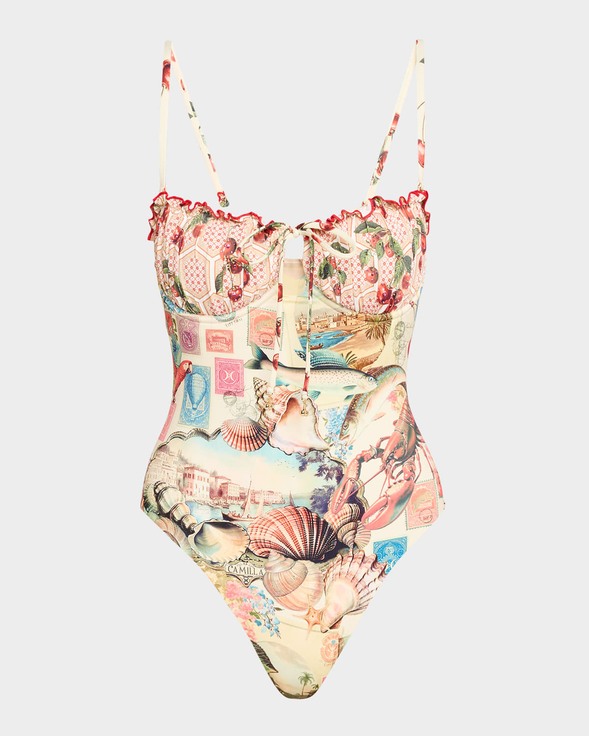 Printed with a bold, layered postcardstyle pattern, this onepiece swimsuit by Camilla is finished with ruffled trim and crystal embellishments for added femininity Faceframing square neckline with central selfties Ruched underwire cups with removable padding Removable, adjustable straps Highcut legs Moderate seat coverage Nylon/polyamide/elastane Dry clean Imported