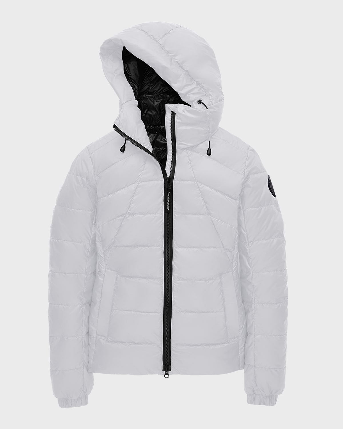Made to travel, the Canada Goose "Abbot" hoodie jacket conveniently packs into its own pocket. The cozy downfilled hood adds comfort and protection, while reflective details at the back create visibility in low light. FeatherLight fabric features durable, waterrepellent, and windresistant properties Adjustable toggle hood; 2way zip front Long sleeves with elasticized cuffs Storm flap underneath zipper keeps the element out Exterior, two handwarmer pockets with hidden snap closure Interior, security zip pocket doubles as a pack pocket Nylon/polyamide Lining: Recycled nylon Machine wash cold, tumble dry low Made in Canada