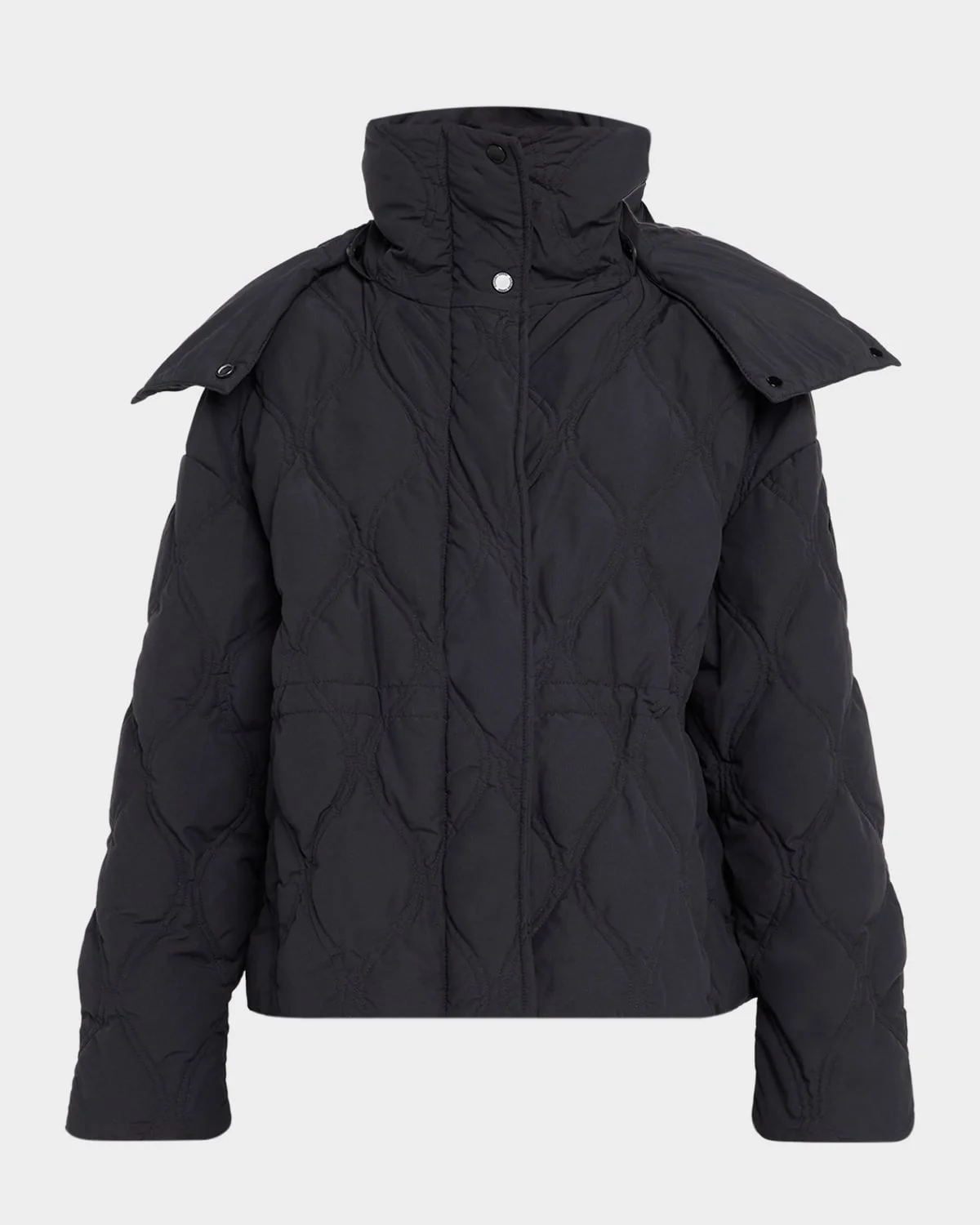 - The "Alessia" quilted down-filled jacket by Canada Goose is a winter-weather essential that features interior straps for hands-free carrying and a snap-off hood for versatile styling. - Stand collar - Long sleeves - Signature tonal logo patch on the left sleeve - Side zip pockets - Internal drawcord waist for adjustable fit - Classic fit - Hem sits at the hip - Zip-front with snap placket - Cotton/nylon/polyamide - Fill: Down/feather - Lining: Nylon - Machine wash cold, inside out; do not iron - Made in Canada