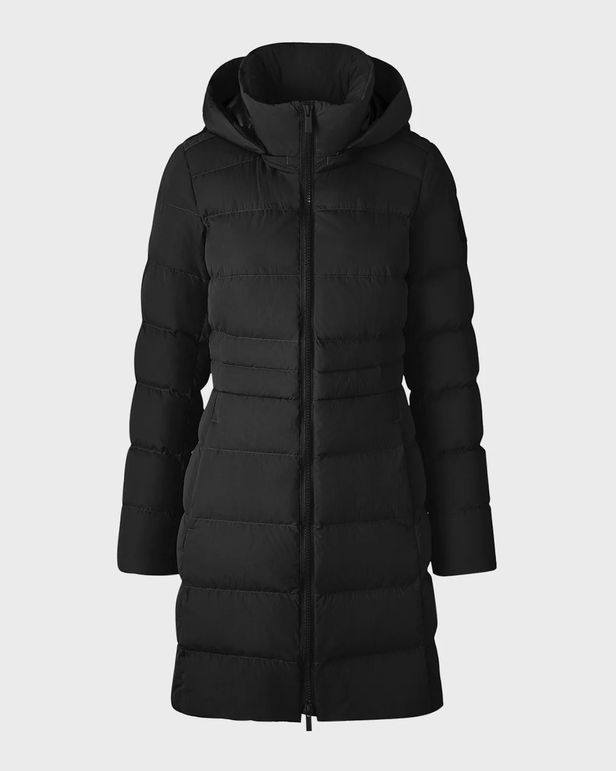 Canada Goose "Aurora" parka with a removable hood and an adjustable drawcord waist Hooded stand collar Twoway zipper front Long sleeves Slip pockets at sides Internal shoulder straps Abovetheknee hem Nylon Lining: Recycled polyester Filing: Feather, down Made in Canada