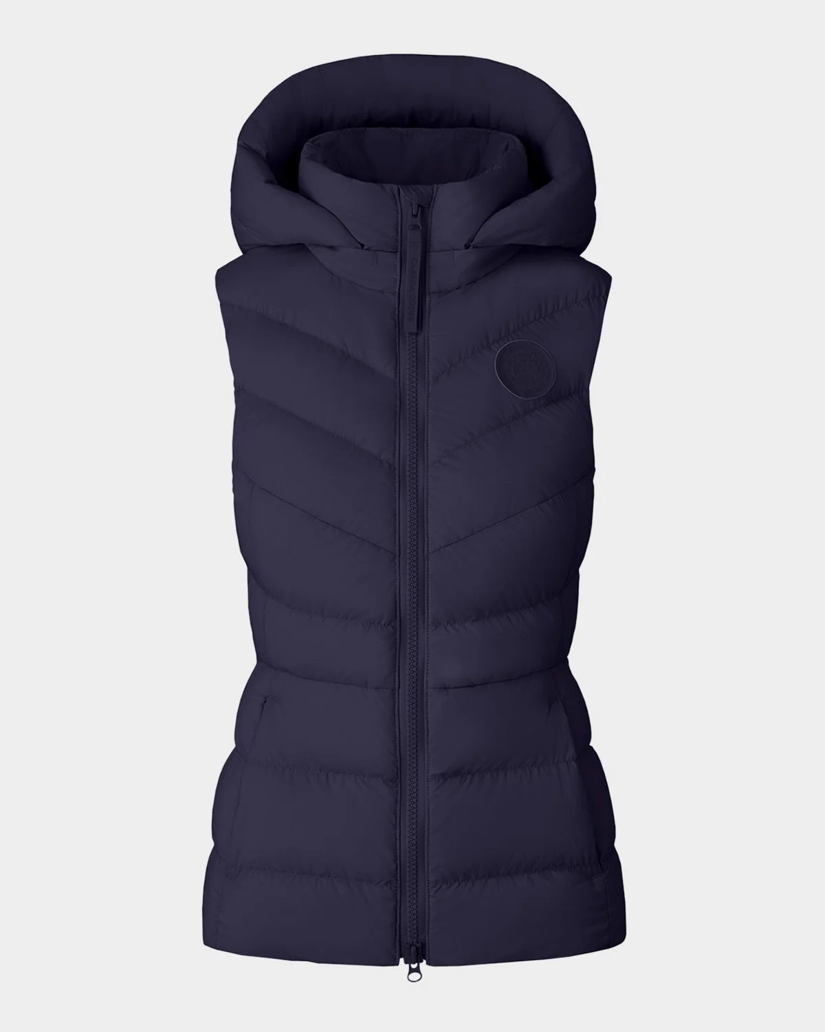 Crafted in twoway stretch Aira fabric with a matte finish, the "Clair" down vest by Canada Goose features contour quilting to hug your body without compromising warmth. Cold weather protection down to 5°F. Interior backpack straps for handsfree carrying Adjustable hooded neckline; twoway zipfront Sleeveless Signature logo patch on the chest Side fleecelined zip pockets Fitandflare silhouette Hem sits at the hip Nylon/polyamide/spandex Fill: Down/feather Lining: Nylon Machine wash cold, inside out Made in Canada