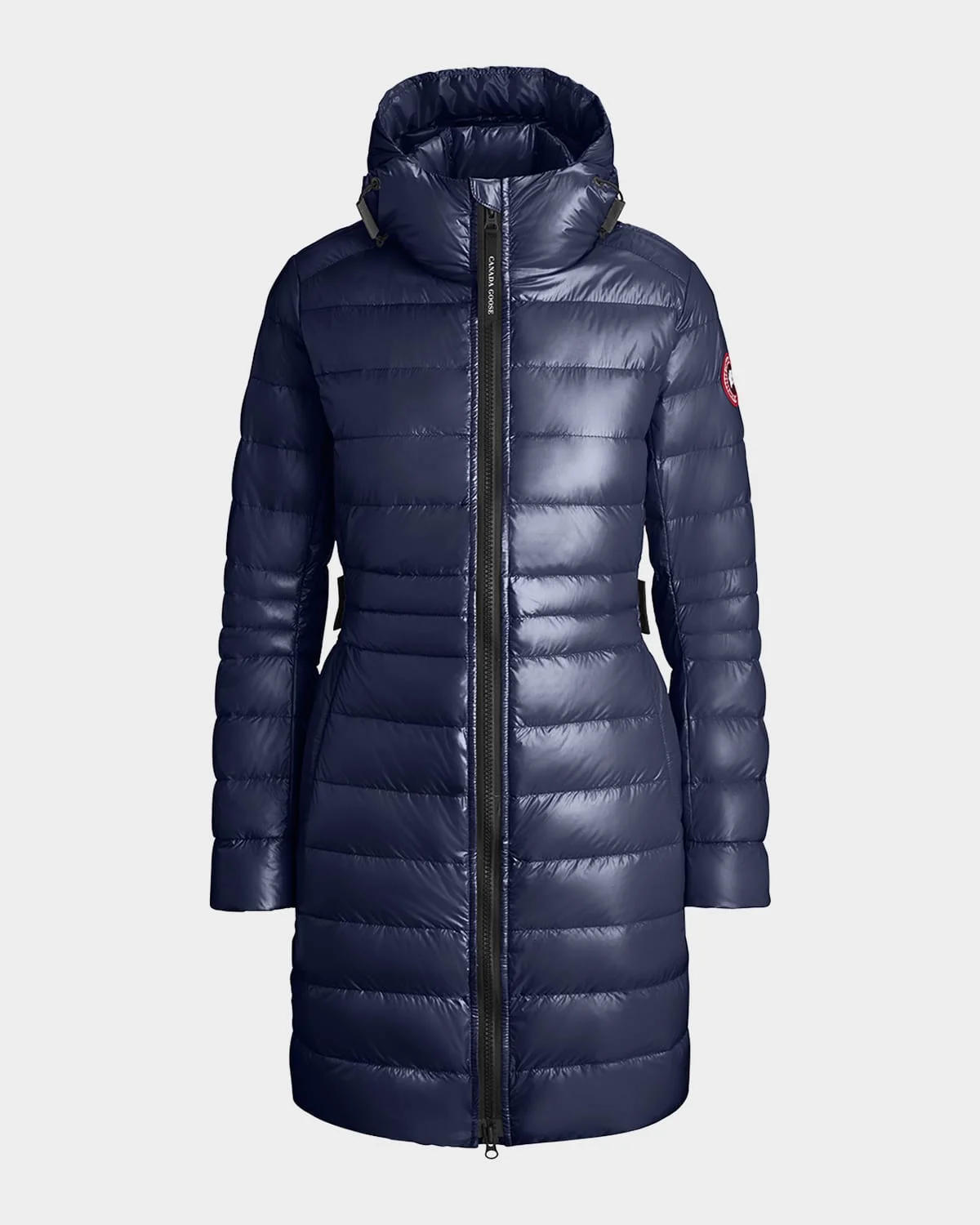 Canada Goose "Cypress" jacket with hood. Approx. 33.25" from shoulder to hem, based on a size small Down-filled adjustable hood; signature double-stripe reflective details at back Stand collar Long articulated sleeves, underarm gussets, recessed power stretch cuffs Two hand pockets with zip closure, two interior drop-in pockets Adjustable belt closure with webbing and snaps Mid-thigh length. Front two-way zip closure, storm flap Recycled nylon shell. 90/10 duck down/feather fill. Remove backpack straps before cleaning. Turn garment inside out. Machine wash cold on gentle cycle, tumble dry low, do not dry clean. Made in Canada of imported material. Model measurements: 5 & apos;10" height, 33.5" bust, 23.5" waist, 34.5" hips, wearing a size small.Fashioned for change: responsible manufacturing. Find out more here