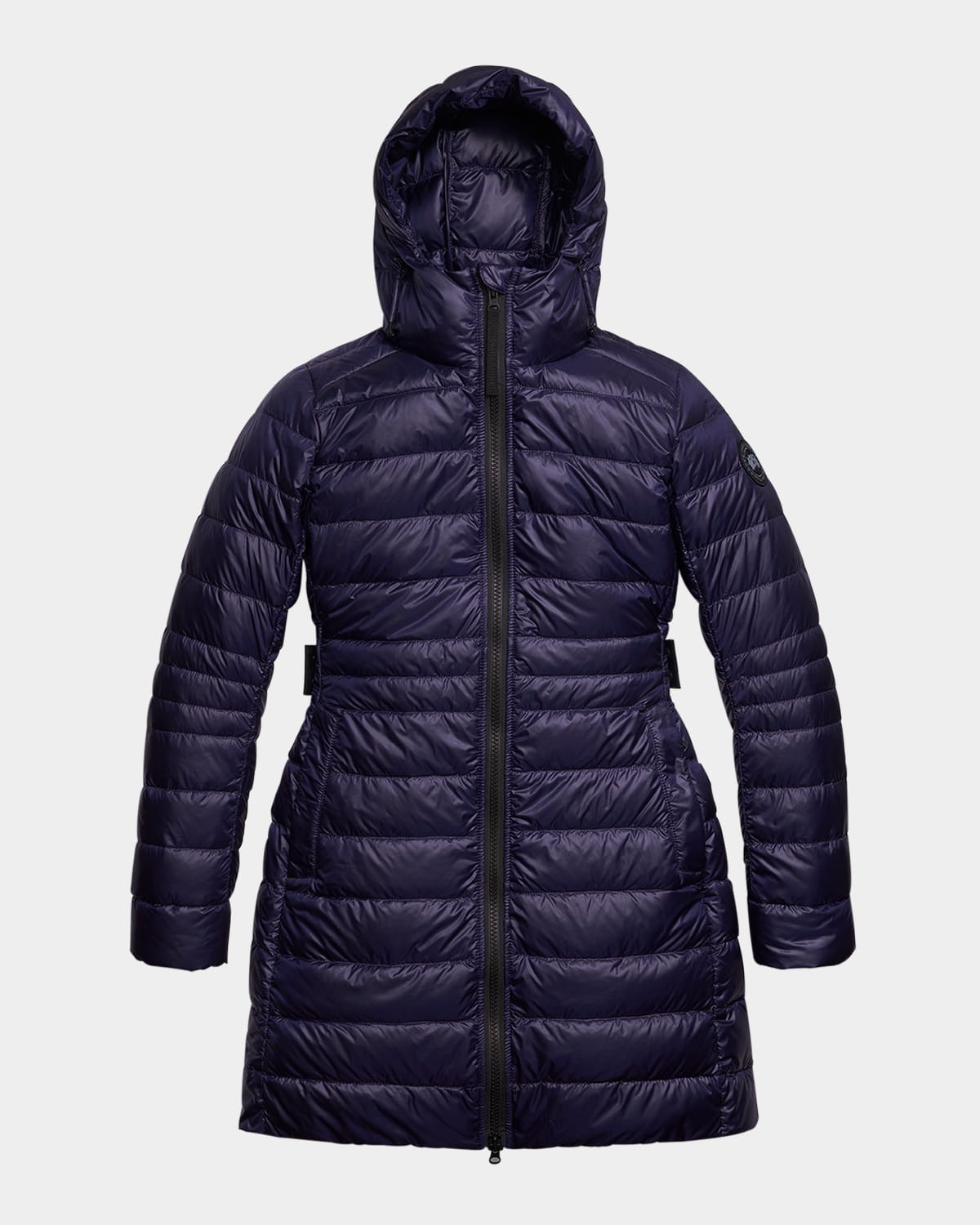 Canada Goose "Cypress" lightweight channelquilt jacket Hooded collar; twoway zipper Long sleeves; black disc at left arm Packable into the interior left pocket Exterior loops provide backpack straps for handsfree carry Pockets at sides Aboveknee length Recycled nylon Lining: recycled nylon Fill: down Made in Canada