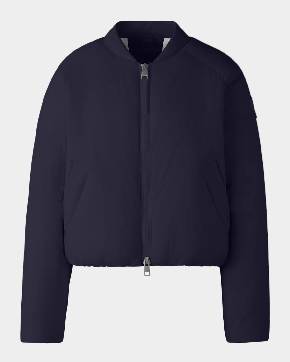 Designed with a minimalist silhouette in ultralightweight Lumina, the "Elba" bomber jacket by Canada Goose offers ease without compromising warmth. Cold weather protection down to 5°F. Packable into left interior pocket with carrying strap. Baseball; twoway zipfront Long sleeves Signature logo patch on the left sleeve Side zip pockets Classic fit Elasticized drawcord hem Nylon/polyamide Fill: Feather/down Lining: Nylon Machine wash cold inside out Imported