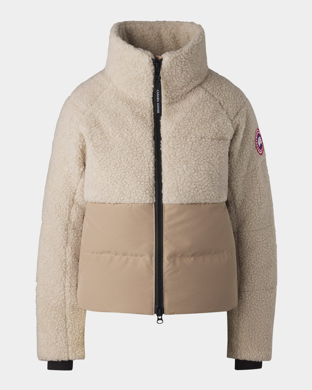 Canada Goose "Elora" puffer jacket Stand collar; twoway zipper closure Long sleeves; ribknit cuffs Logo patch at left sleeve Side seam pockets Interior security pocket Hip length Adjustable drawcord hem Polyester/organic cotton Lining: Recycled nylon Fill: Down/Feather Do not iron, machine wash cold, inside out Made in Canada
