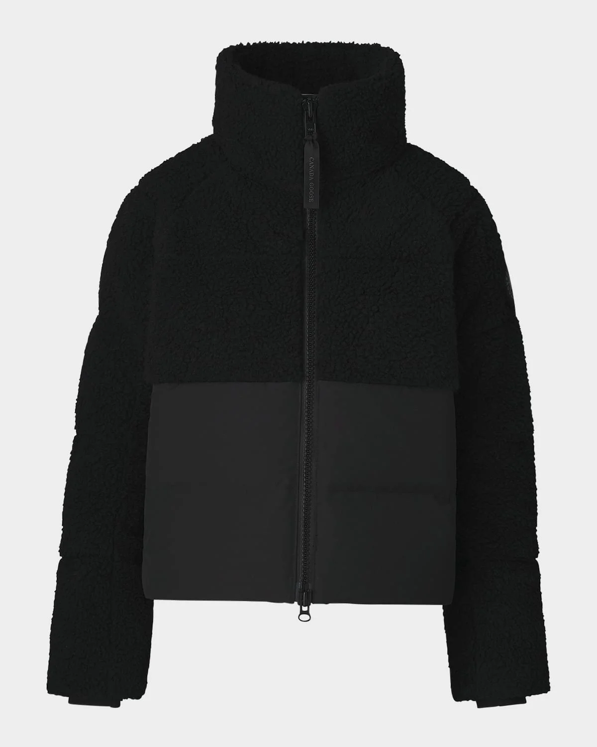Canada Goose "Elora" puffer jacket Stand collar; twoway zipper closure Long sleeves; ribknit cuffs Logo patch at left sleeve Side seam pockets Interior security pocket Hip length Adjustable drawcord hem Polyester/organic cotton Lining: Recycled nylon Fill: Down/Feather Do not iron, machine wash cold, inside out Made in Canada