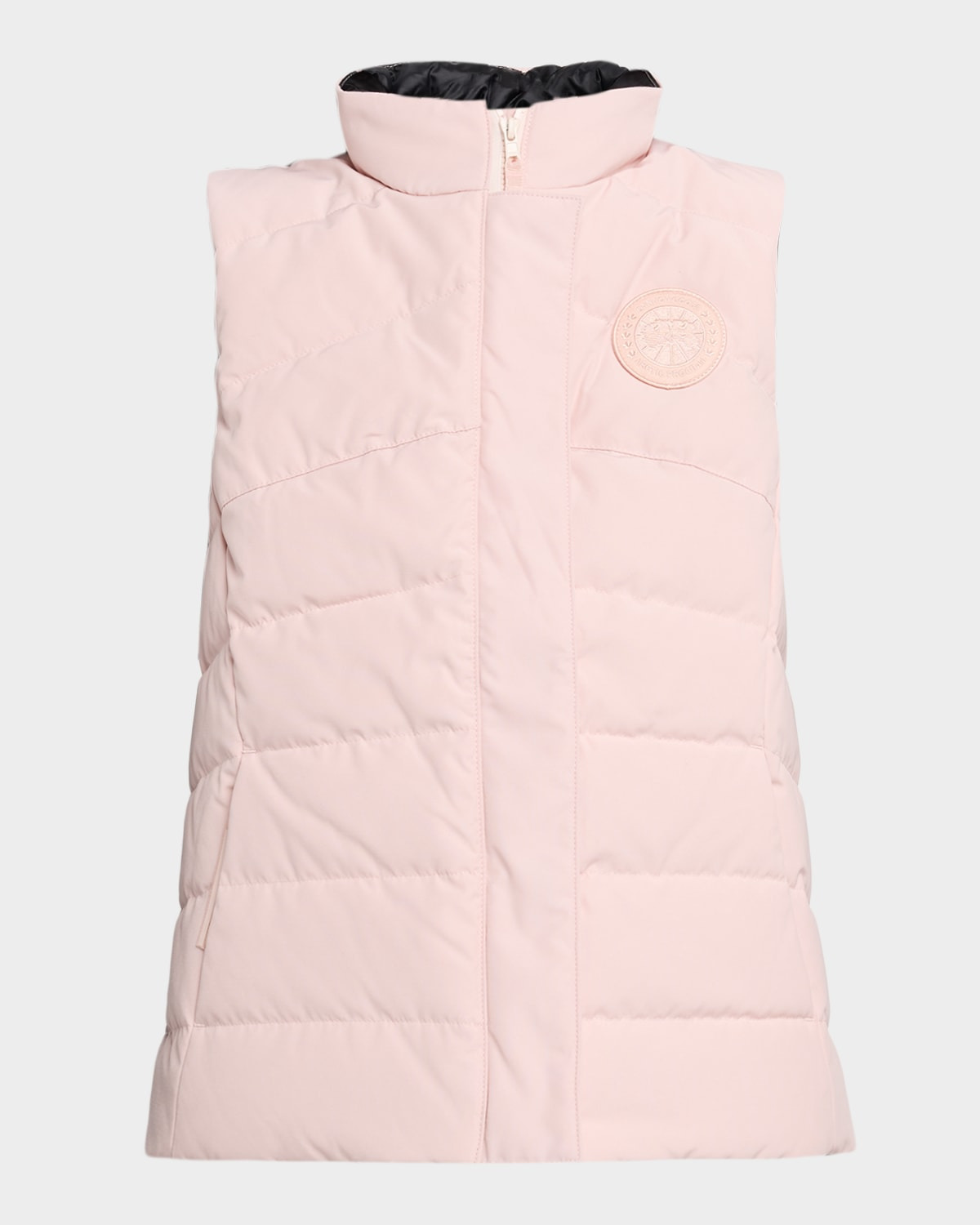 Crafted in signature recycled organic Arctic Tech® fabric, the "Freestyle" down vest by Canada Goose offers warmth with ample layering opportunities. Cold weather protection down to 23°F. Stand collar; twoway zipfront with snap placket Sleeveless Signature tonal logo patch on the chest Side zip pockets; one interior pocket Classic fit Polyester/cotton Fill: Down/feather Lining: Nylon Dry clean Made in Canada