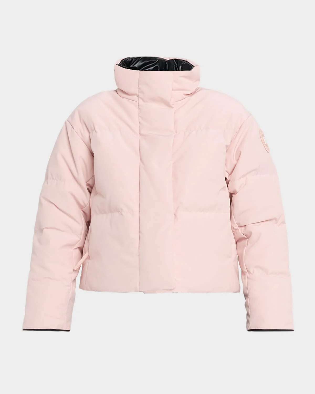 Featuring a cropped silhouette, the "Grandview" puffer jacket by Canada Goose is crafted in waterrepellent recycled organic Arctic Tech® fabric for extremeweather protection down to 5°F. Interior backpack straps for handsfree carrying Stand collar; twoway zipfront with snap placket Long sleeves with ribknit cuffs Signature logo patch on the left sleeve Side seam zip pockets; two interior pockets Cropped fit Interior drawcord hem Polyester/cotton Fill: Down/feather Lining: Nylon Dry clean only Made in Canada