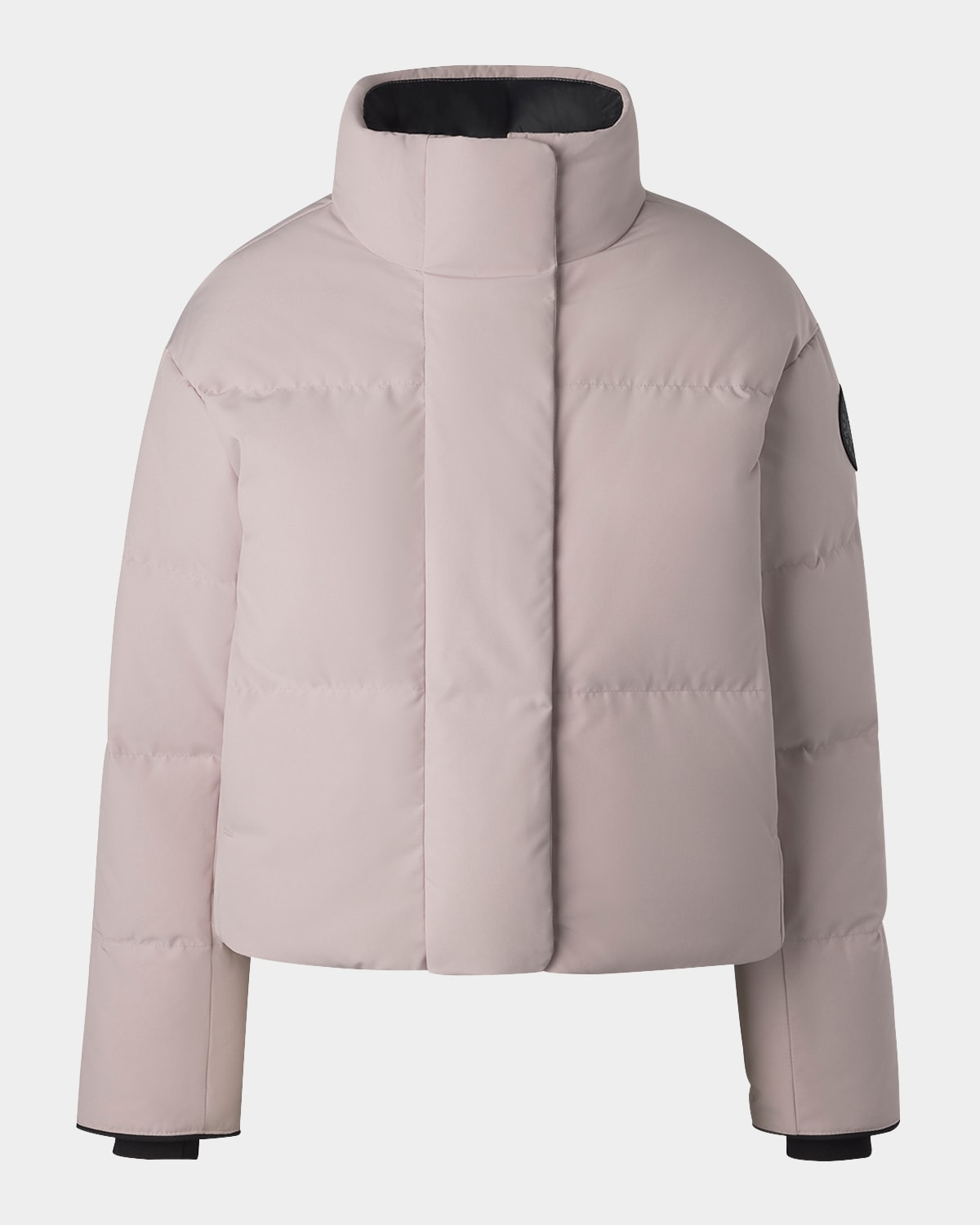 Canada Goose "Grandview" durable puffer jacket Stand collar Snap button closure over twoway zipper Long sleeves; ribknit cuffs Black logo disc at left sleeve Fixed backpack straps Two exterior sideentry zippered hand pockets Three interior pockets: two mesh dropin pockets, one zippered security pocket Cropped length Interior drawcord at hem Polyester/organic cotton Lining: Recycled nylon Fill: Down/Feather Do not iron, dry clean Made in Canada
