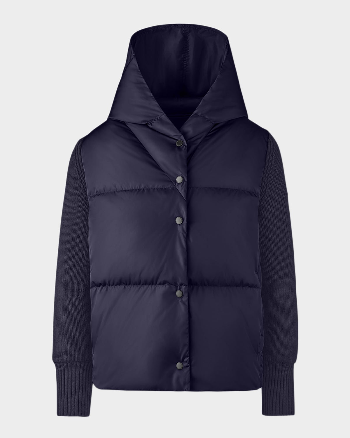 Crafted in merino wool for breathability, the "HyBridge® Astoria" hoodie jacket by Canada Goose features downfilled paneling in Performance Nylon and an adjustable drawcord waist for a peplum silhouette. Hooded neckline Long sleeves with ribbed cuffs Side zip pockets Relaxed fit Hem falls to the hip Offcenter snap placket Merino wool Dry clean only Imported