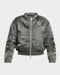Crafted in nylon gaberdine with satin finish, the "Jade" bomber jacket by Canada Goose features authentic flightinspired details for style and down filling for added warmth. Cold weather protection down to 5°F. Interior backpack straps for handsfree carrying Baseball collar; twoway zipfront Long ruched sleeves with ribknit cuffs Signature logo patch on the chest Side fleecelined zip pockets Classic fit Elasticized hem Nylon/polyamide Fill: Down/feather Lining: Nylon Machine wash cold, inside out Made in Canada