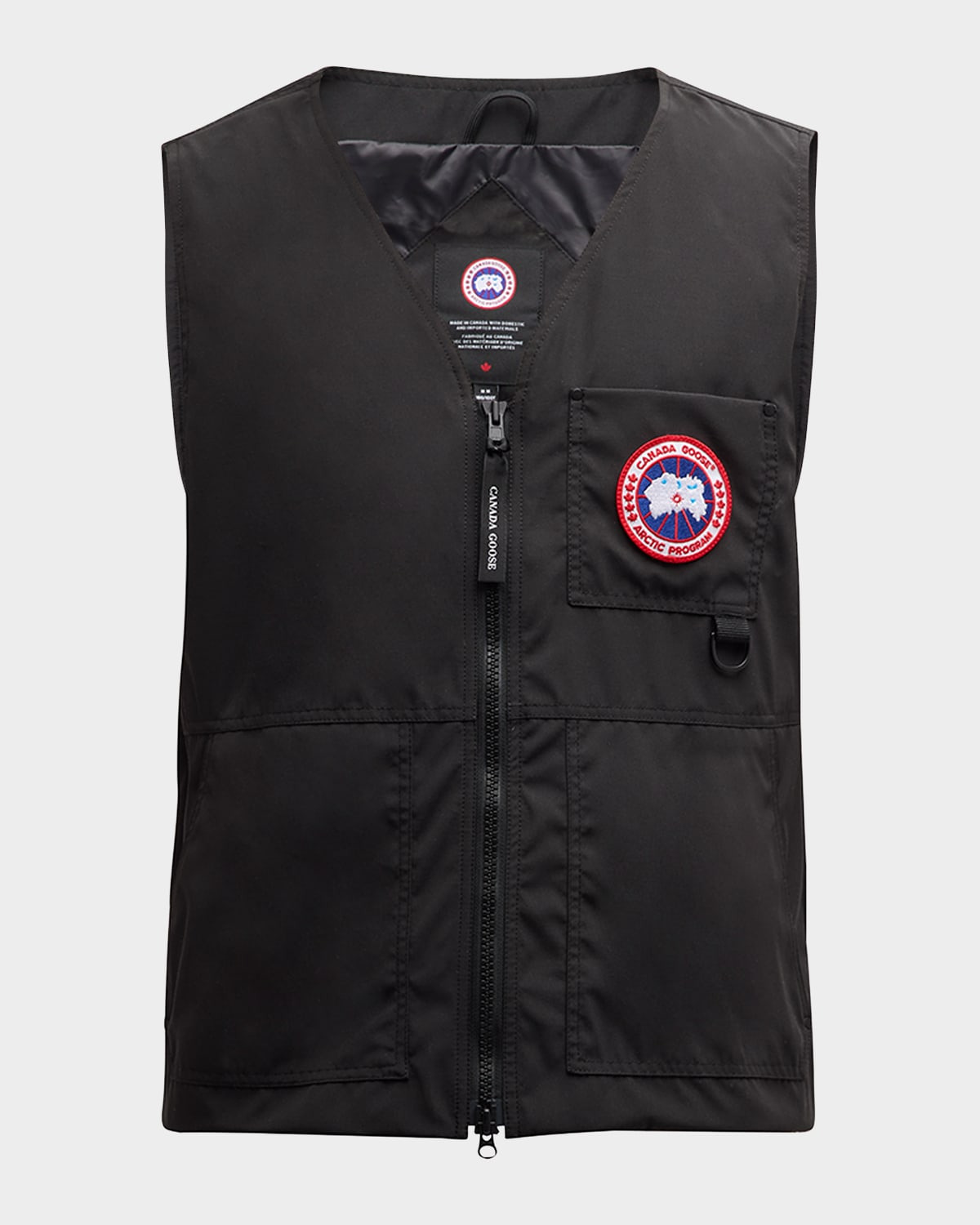 - The Canmore vest uses modern design elements inspired by traditional workwear to create essential transitional styles. - Canada Goose "Canmore" vest in recycled organic Arctic Tech®, a durable fabric with a water-repellent finish - V neckline; two-way zip closure - Signature double stripe reflective on upper back - Iconic label logo patch - Drop-in patch pocket with D-ring attachment - Side entry pockets, back zippered pocket - Polyester/organic cotton - Machine wash cold, line dry, wash inside out - Made in Canada - Model is 6'1"/185cm.