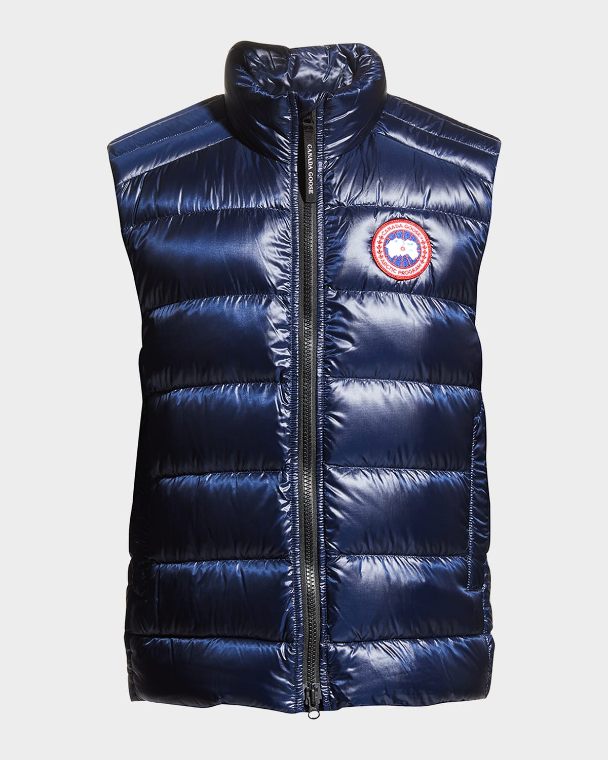 - Canada Goose "Crofton" quilted vest in ultra-lightweight construction. - TEI 1 is optimal for temperatures 40°F to 25°F; It is lightweight and adaptable for active pursuits - Packable into interior left pocket. - Stand collar; two-way zip front. - Chest patch pocket. - Sleeveless. - Recycled nylon. - 80/20 down/feather fill. - Made in Canada. - The Thermal Experience Index (TEI) is an easy-to-understand five point system that enables you to make an informed choice in your search to find the right parka, jacket, or knitwear for your specific environment and activity. It works using a scale, in which 1 indicates the lightest insulation--jackets, lightweight down for active pursuits--and 5 indicates the warmest parkas we make, the kind trusted in the world’s harshest conditions.