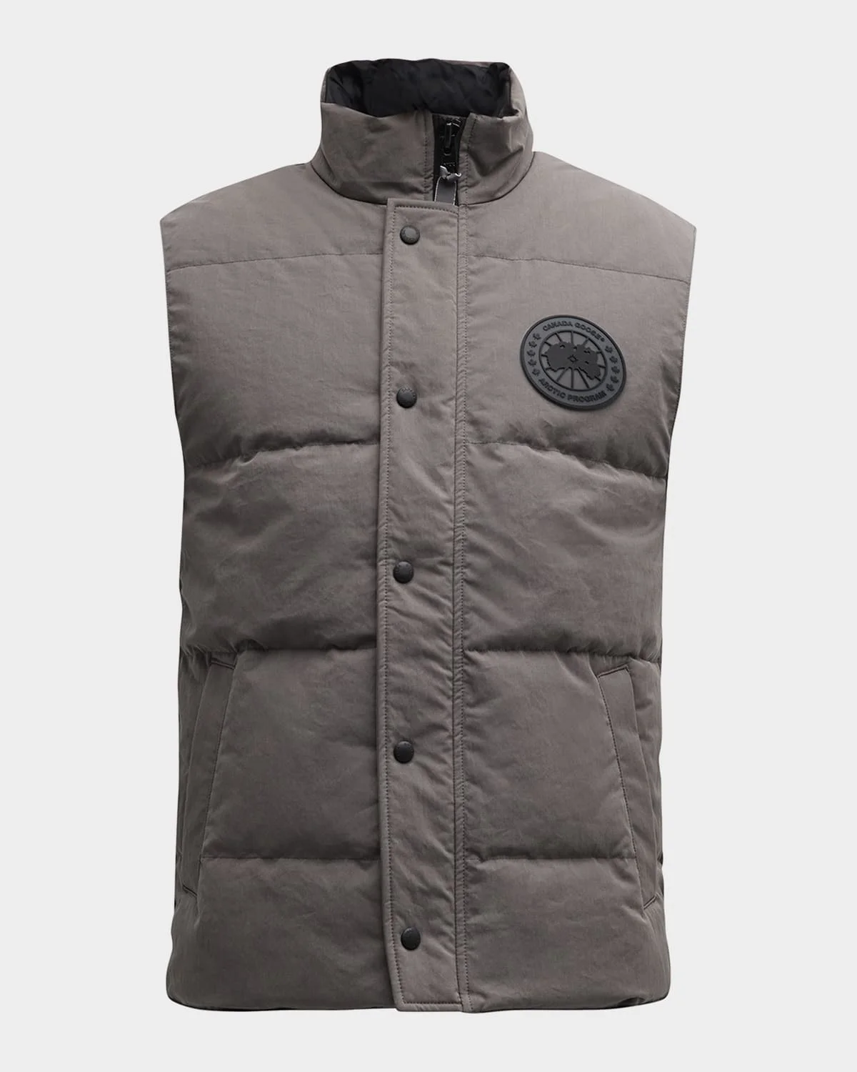 - Canada Goose "Garson" vest crafted in a crinkle cotton blend - TEI 1 is optimal for temperatures 40°F to 25°F; It is lightweight and adaptable for active pursuits - Stand collar - Zip/snap placket - Disc logo patch at chest - Welt pockets - Sleeveless - Protective, hi-low hem - Wind-resistant - Cotton/nylon - Fill: Down - Dry clean, machine wash cold, tumble dry, wash inside out - Made in Canada - The Thermal Experience Index (TEI) is an easy-to-understand five point system that enables you to make an informed choice in your search to find the right parka, jacket, or knitwear for your specific environment and activity. It works using a scale, in which 1 indicates the lightest insulation--jackets, lightweight down for active pursuits--and 5 indicates the warmest parkas we make, the kind trusted in the world’s harshest conditions.