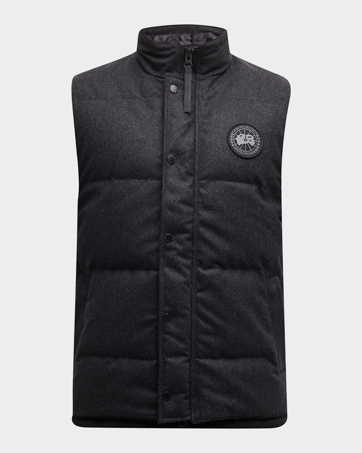 - Canada Goose "Garson" vest crafted in wind-resistant two-layer wool - TEI 1 is optimal for temperatures 40°F to 25°F; It is lightweight and adaptable for active pursuits - Stand collar; tricot-lined chin guard for comfort - Storm flap over front zipper keeps out drafts - Signature disc patch at chest - Exterior fleece-lined handwarmer pockets - Interior drop-in pockets - Hip length; cut longer in back for more protection from cold and wind - Sleeveless - Recycled wool/nylon - Lining: Recycled polyester - Fill: Down - Made in Canada - The Thermal Experience Index (TEI) is an easy-to-understand five point system that enables you to make an informed choice in your search to find the right parka, jacket, or knitwear for your specific environment and activity. It works using a scale, in which 1 indicates the lightest insulation--jackets, lightweight down for active pursuits--and 5 indicates the warmest parkas we make, the kind trusted in the world’s harshest conditions.