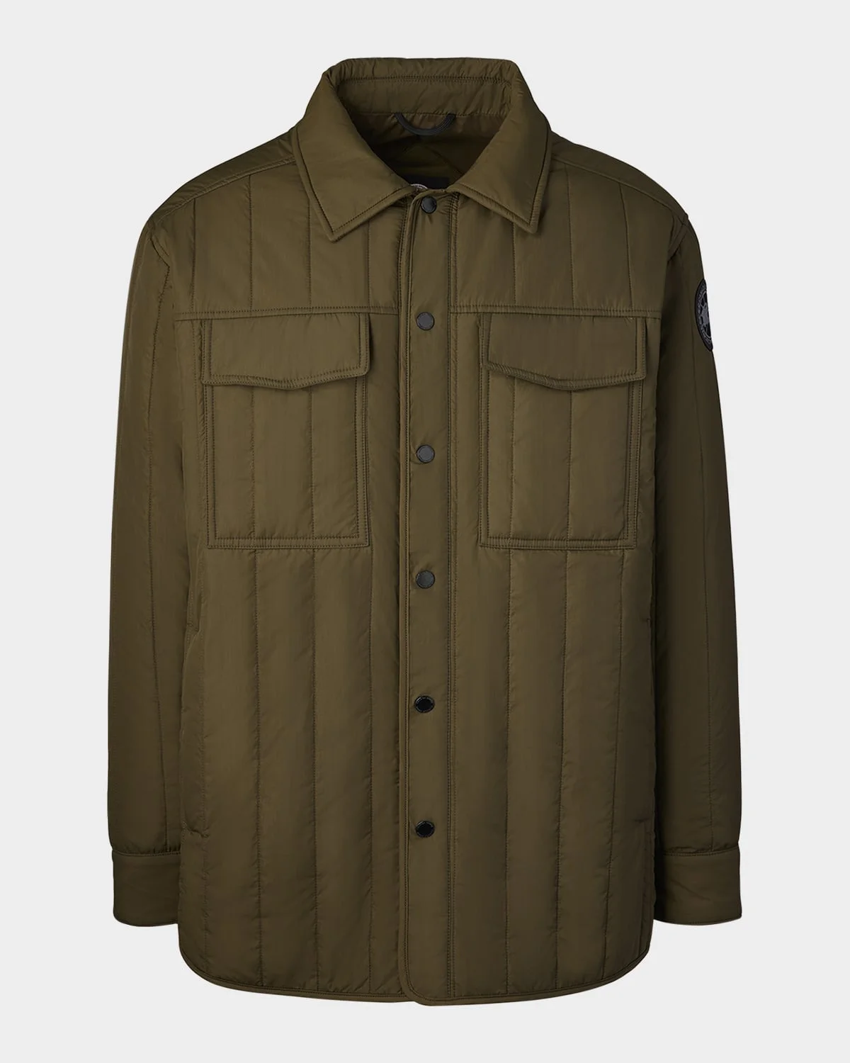 - Equal parts tactical and versatile, the Carlyle quilted shirt jacket is an all-purpose, all-season staple. - Continuing our commitment to sustainability and keeping the planet cold and the people on it warm, this style is insulated with 100% tencel™ lyocell, a biodegradable fiber made from wood pulp harvested from sustainably managed forests. - Canada Goose "Carlyle" quilted overshirt - Spread collar; snap front closure - Two chest flap pockets - Long sleeves - Black Label patch at left sleeve - Yoked back shoulders - Nylon self and fill - Made in Romania - Model is 6'1"/185cm.
