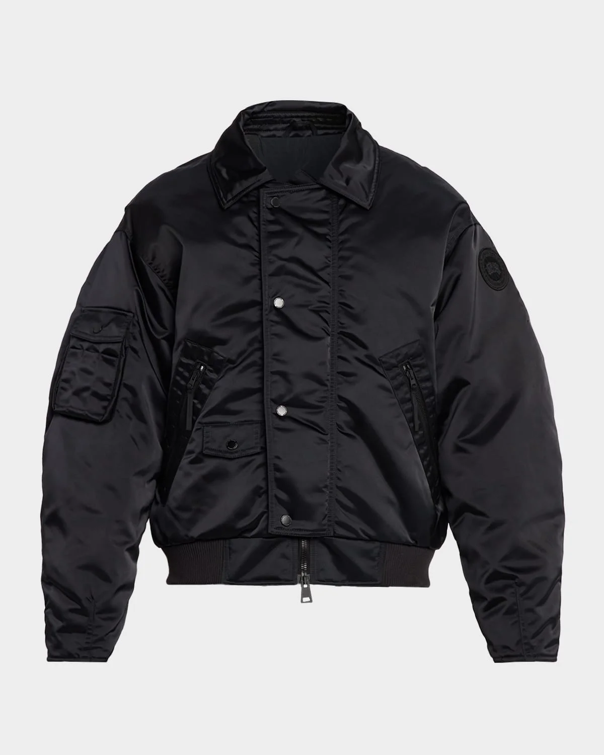 Canada Goose "Seguin" bomber jacket blends modern utility with the brand's tactical DNA for a classic aviator style in a smooth, gloss finish Spread collar Long sleeves Dropped shoulders Two fleecelined zippered hand pockets Sleeve pocket and pen pocket with snap closure Interior backpack straps for handsfree carrying Ribbed hem Snap front closure Nylon/polyamide Machine wash cold, machine wash line dry, wash inside out Made in Canada