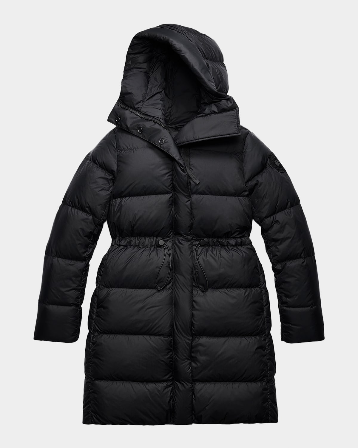 Crafted from ultralightweight Lumina, the "Montgomery" downfilled coat by Canada Goose features an Aline silhouette with cinchable drawcord waist for a custom fit. Cold weather protection down to 4°F. Interior backpack straps fro handsfree carrying. Adjustable hooded neckline Long sleeves with ribknit cuffs Signature logo patch on the left sleeve Side zip pockets Classic fit Midthigh length Twoway zipfront with snap placket Nylon/polyamide Fill: Down/feather Lining: Nylon Machine wash cold, inside out Made in Canada