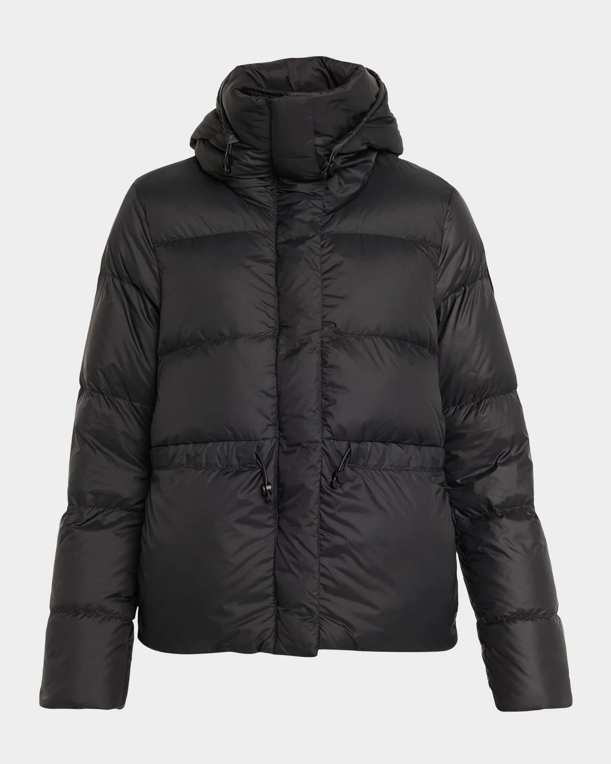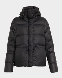 Crafted from ultralightweight Lumina, the "Montgomery" puffer jacket by Canada Goose features an adjustable drawcord hood and waist for a personalized fit that locks in warmth. Coldweather protection down to 4°F. Features interior backpack straps for handsfree carrying Hooded neckline Long sleeves with ribknit cuffs Signature logo patch on the left sleeve Side zip pockets; two interior pockets Classic fit Short length Twoway zipfront with snap placket Nylon/polyamide Fill: Down/feather Lining: Nylon Machine wash cold inside out Made in Canada
