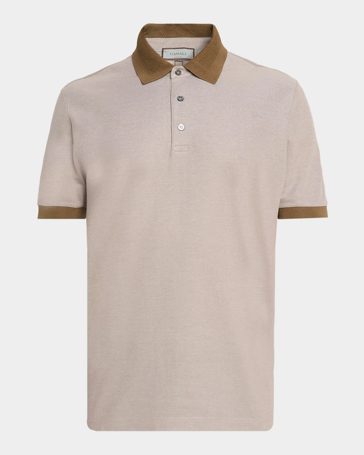 A contrasting collar and cuffs combined with breathable cotton pique make the Canali polo shirt an elegant wardrobe staple Spread collar Threebutton placket Ribbed cuffs Short sleeves Vented sides Classic fit Pullover style Cotton Machine wash line dry Made in Italy