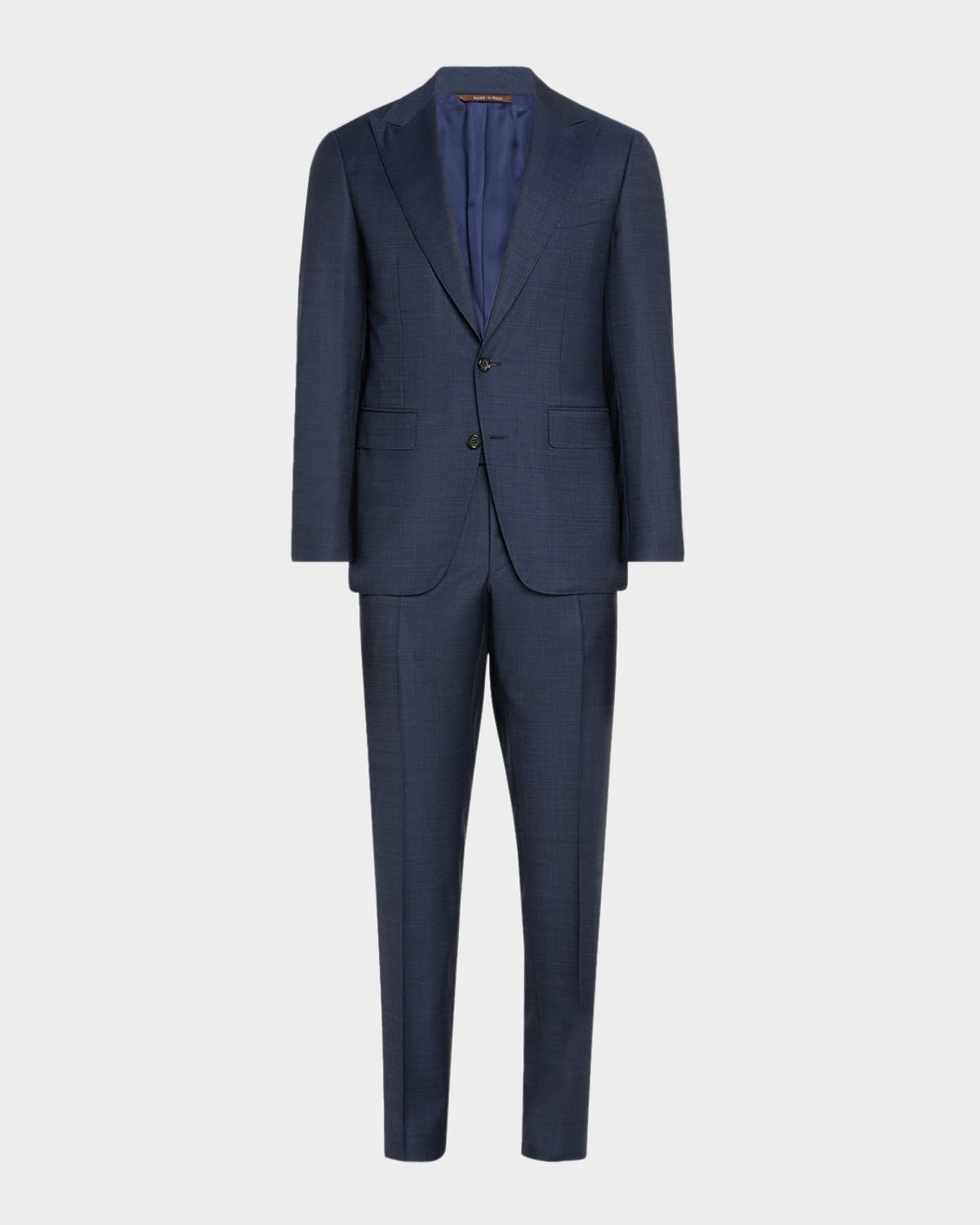 - Canali two-piece heathered solid suit - Classic fit - Wool - Dry clean - Made in Italy - Jacket: - Peaked lapels; two-button front - Chest welt pocket; side flap pockets - Basted sleeves - Double-vented back - Trousers: - Regular rise - Flat front - Side slip pockets - Back welt pockets - Straight legs - Button/zip fly; belt loops - Model is 6'1"/185cm.