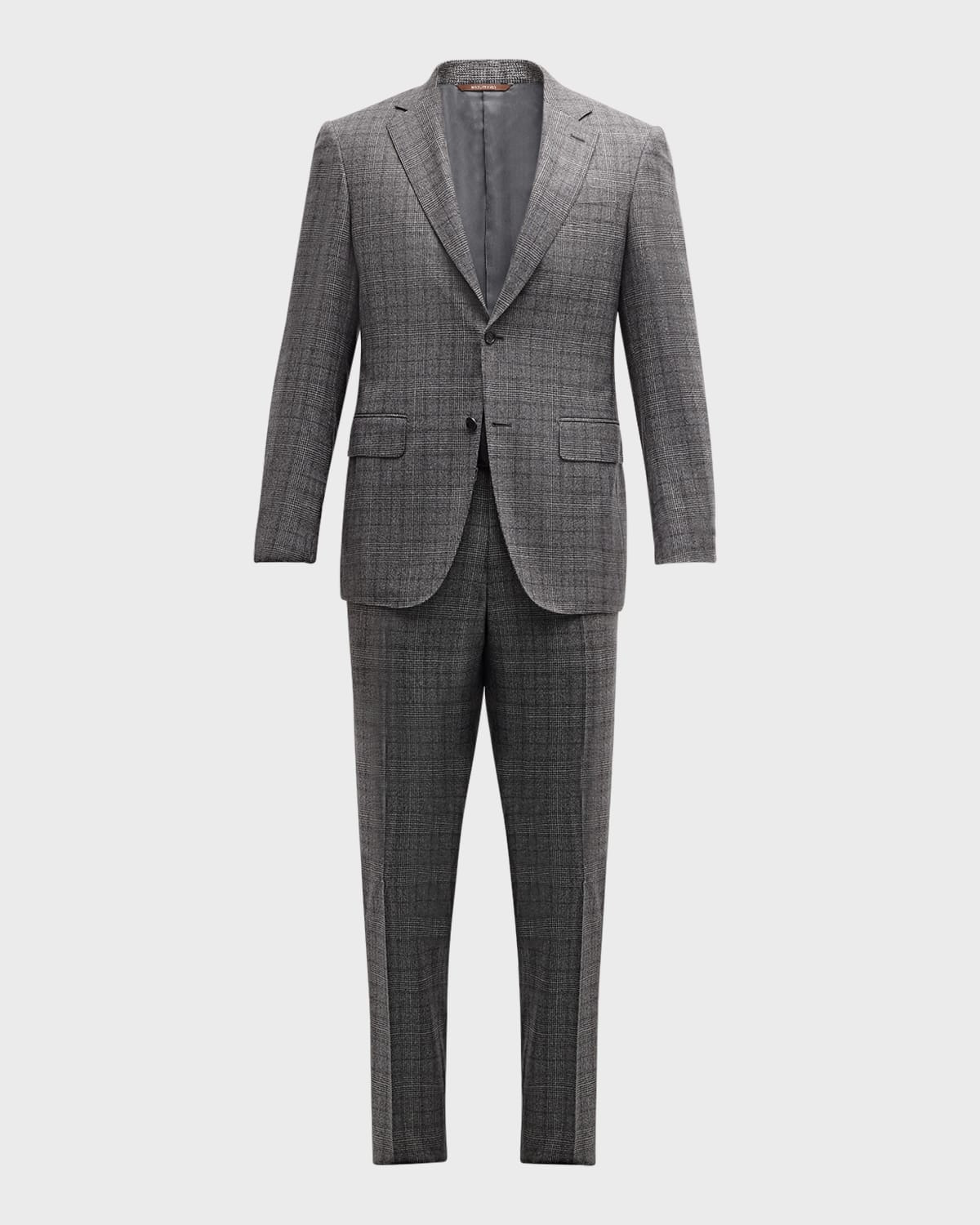 - Canali suit in Prince of Wales check - Notched lapels - Two-button closure - Chest welt pocket; side flap pockets - Unfinished sleeves - Double-vented back - Flat-front trousers - Straight legs - Wool - Lining: Cupro - Dry clean - Made in Italy - Model is 6'1"/185cm.