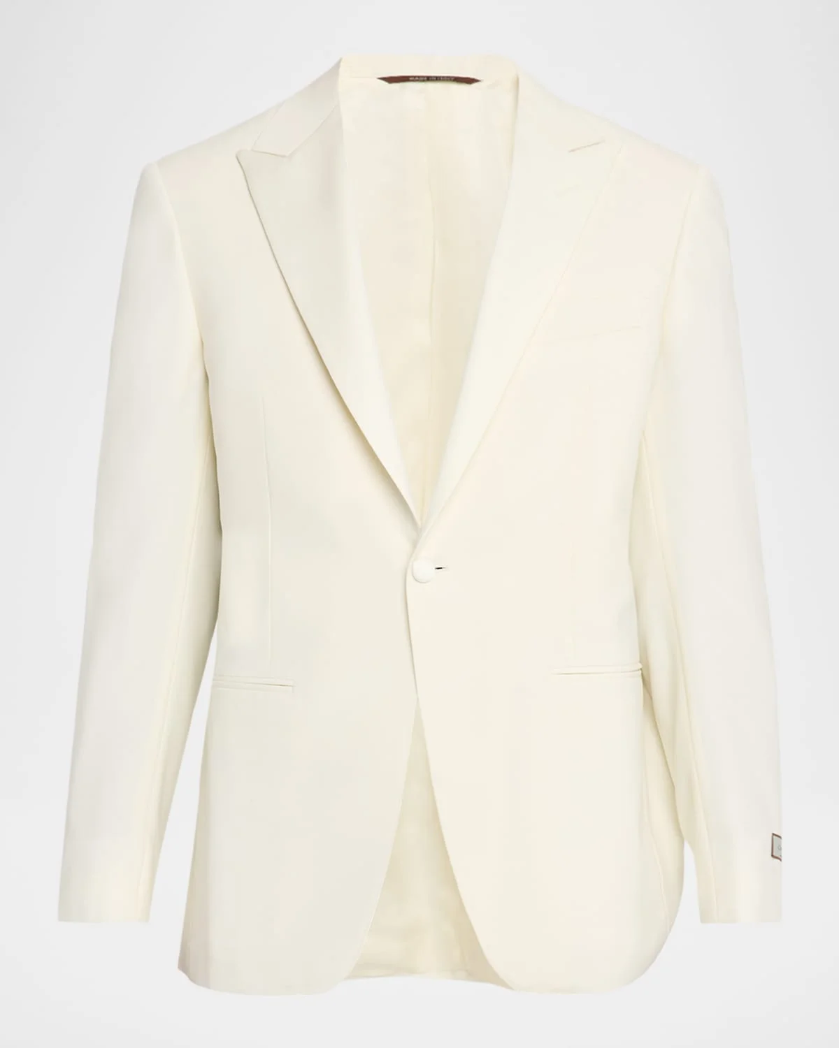 Canali formal dinner jacket in fine wool, creating a sleek and sophisticated finish Peak lapels Singlebreasted front Chest welt pocket Hip besom pockets Internal breast pocket Doublevented back Tailored fit Wool Lining: Cupro Dry clean Made in Italy