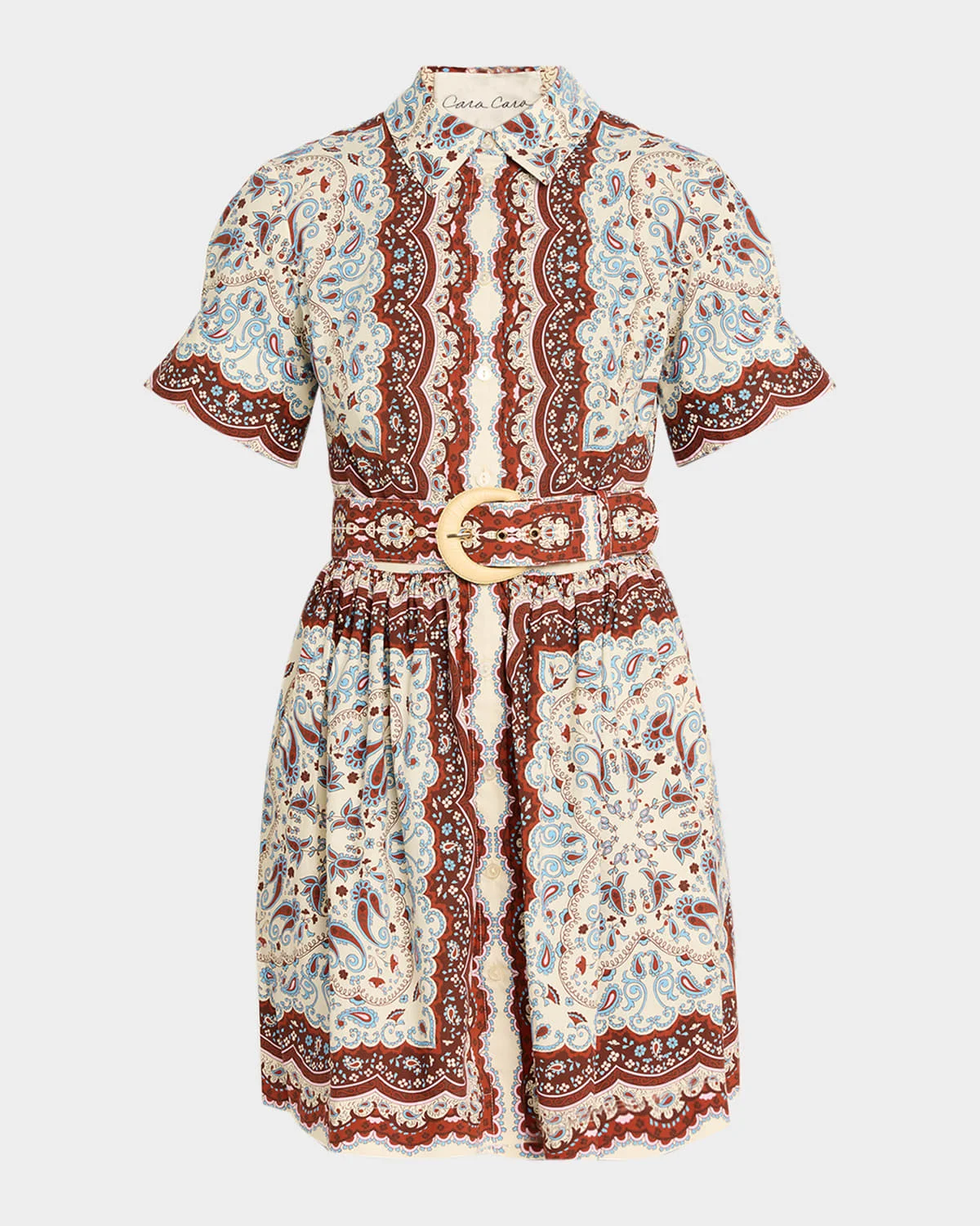 Decorated in an allover paisley print, the "Malena" mini dress by Cara Cara is crafted from breathable cotton and features a removable belt to cinch the waist. Point collar Short sleeves Side pockets Shirtdress silhouette Hem falls above the knee Buttonfront Cotton Dry clean Imported