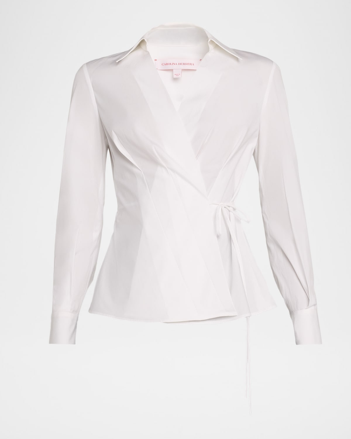 - Carolina Herrera wrap top fetauring waist pleats - Spread collar - Long sleeves; button cuffs - Slim fit - Self-tie waist closure - Cotton/polyurethane - Dry clean - Made in Italy