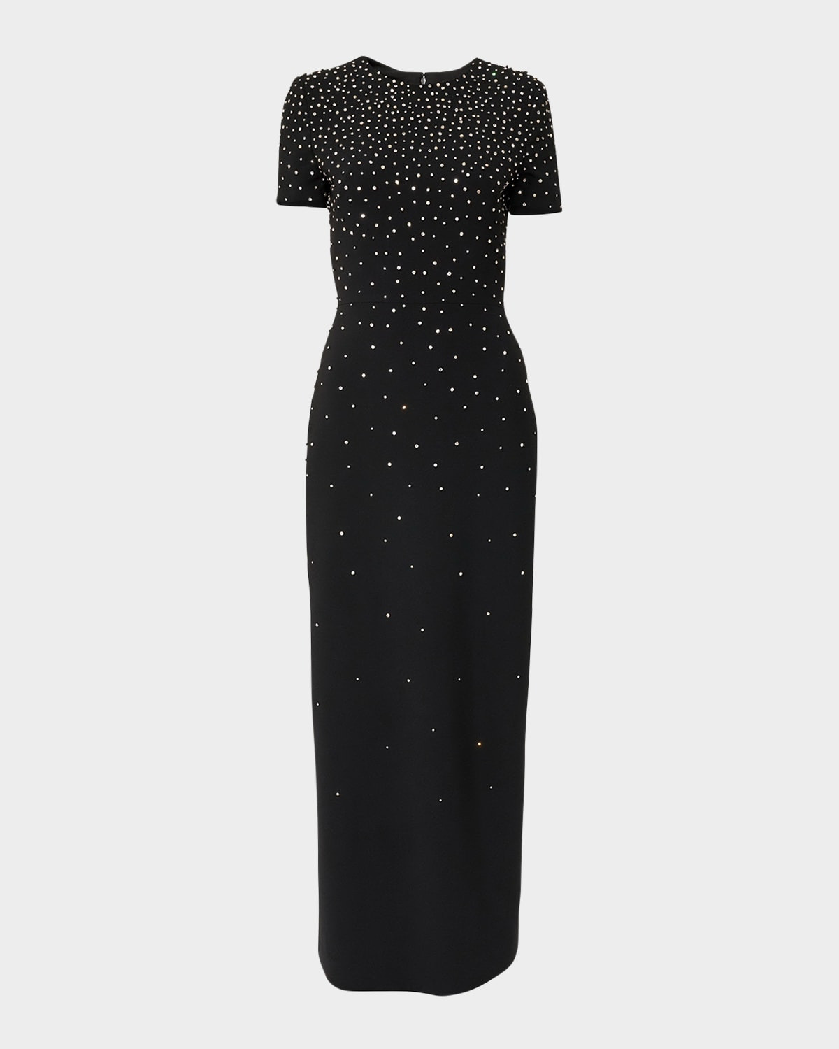 - Carolina Herrera gown embellished with degrade crystal embroidery and a bow back detail - Round neckline - Short sleeves - Column silhouette - Floor length - Walking vent back - Back zip - Polyester/polyurethane - Dry clean - Imported
