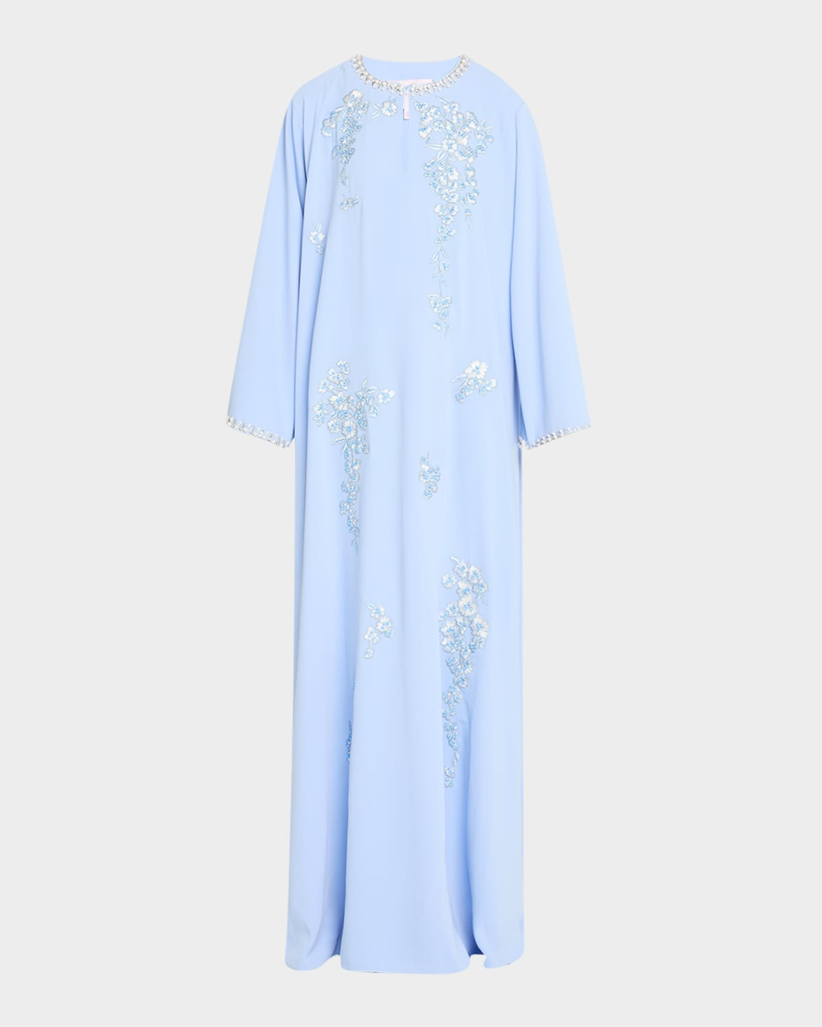 - Carolina Herrera caftan dress featuring floral embroidery and pearly crystal bead embellishment - Round neckline; hook/keyhole front - Long sleeves - Ahift silhouette - Full length - Slipover style - Polyester - Dry clean - Imported