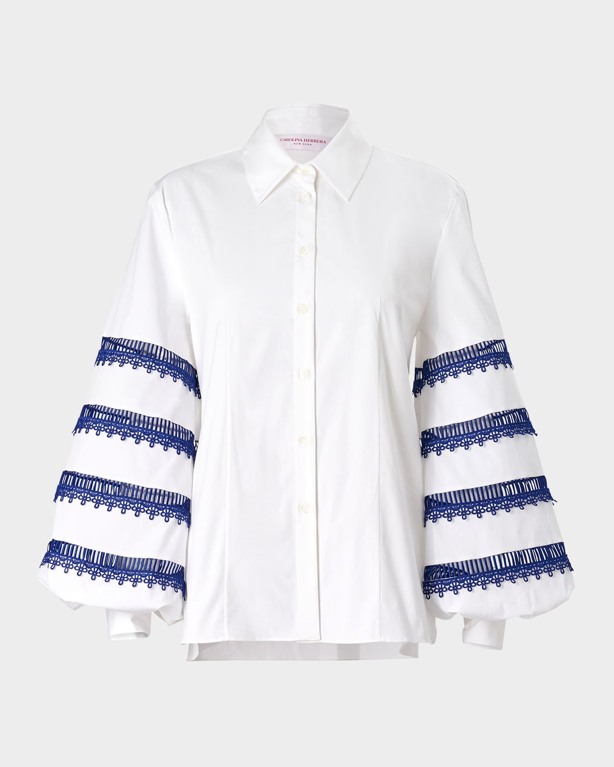 - Carolina Herrera shirt featuring lattice embroidered sleeve inset - Point collar; button front - Long puff sleeves; button cuffs - Slim fit - Side slits - Cotton/polyurethane - Dry clean - Imported
