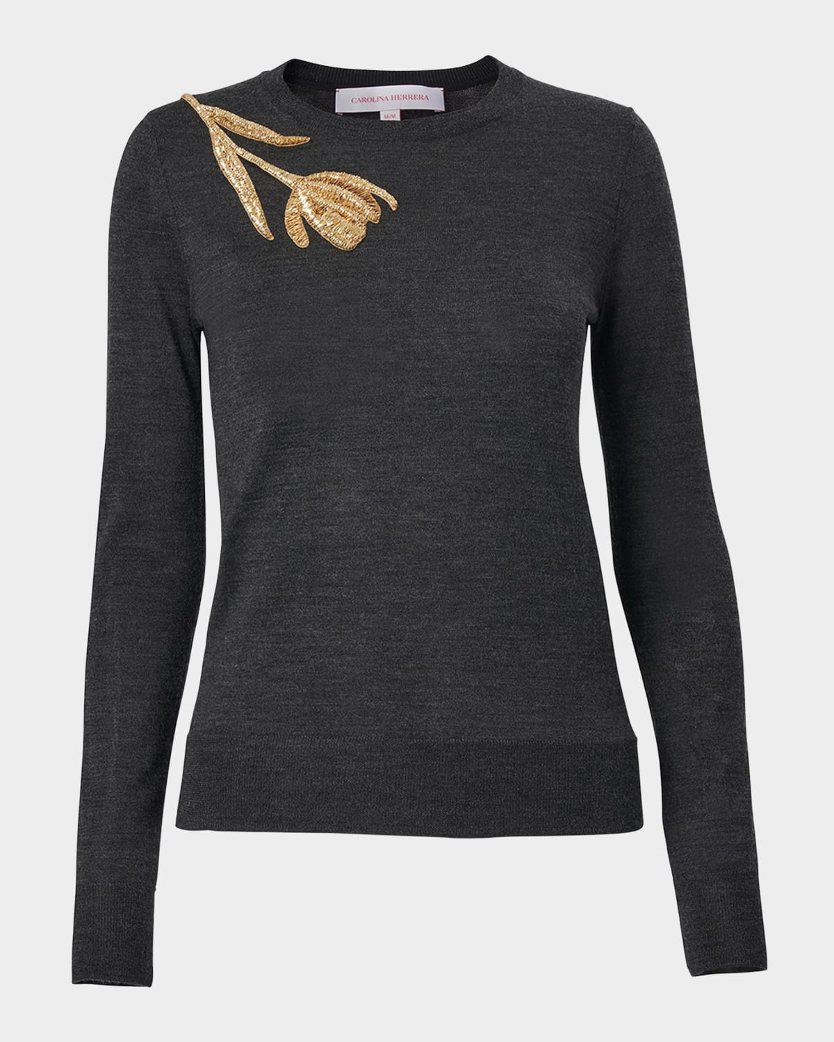 - Carolina Herrera lightweight sweater embellished with a metallic 3D tulip across the right shoulder - Crew neckline - Long sleeves - Slim fit - Hip length - Pullover style - Virgin wool/silk - Dry clean - Imported
