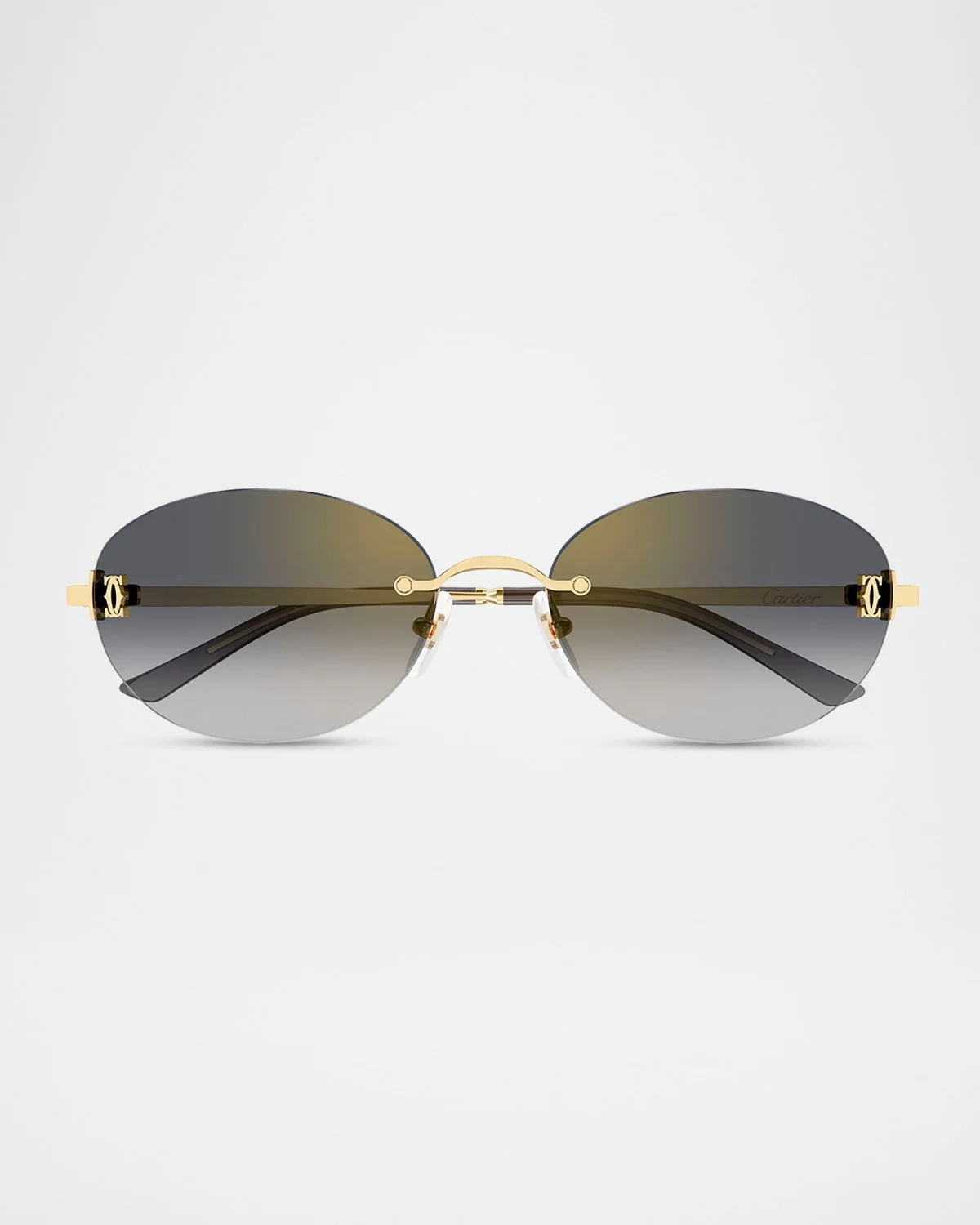 Cartier "CT0642SA" oval sunglasses feature a rimless silhouette enhanced with gold-tone logo hardware on the front profile. Eye/bridge/temple (in mm): 54-18-145 Mirrored gradient lenses Adjustable nose pads Engraved logo on temples Acetate tips for comfort Metal 100% UVA/UVB protection Made in France