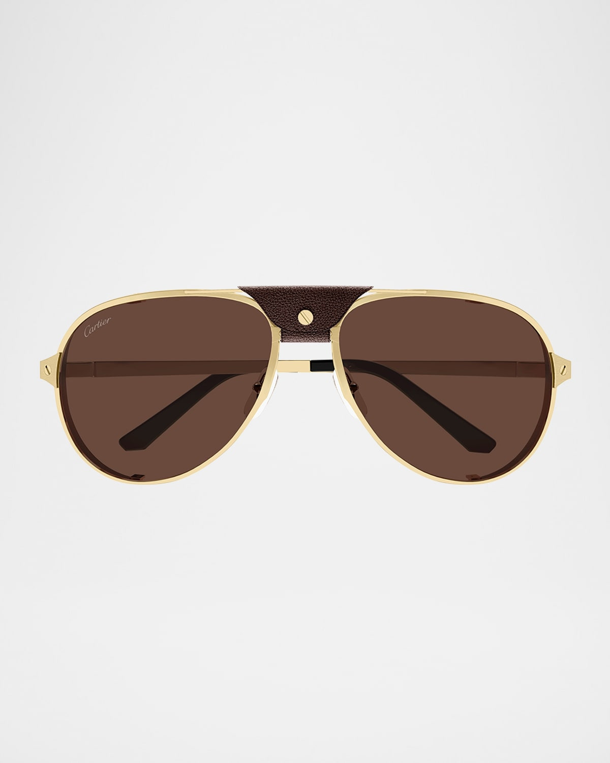 - Cartier "CT0296SM" aviator sunglasses in metal - Lens/bridge/temple (in mm): - 61-17-135 - Features a leather nose bridge and leather side shields - Solid-color lenses - Right lens logo script - Adjustable nose pads - Engraved logo on the temples - Curved, capped temple tips - Metal/leather - Made in Italy - Proposition 65 warning for California residents