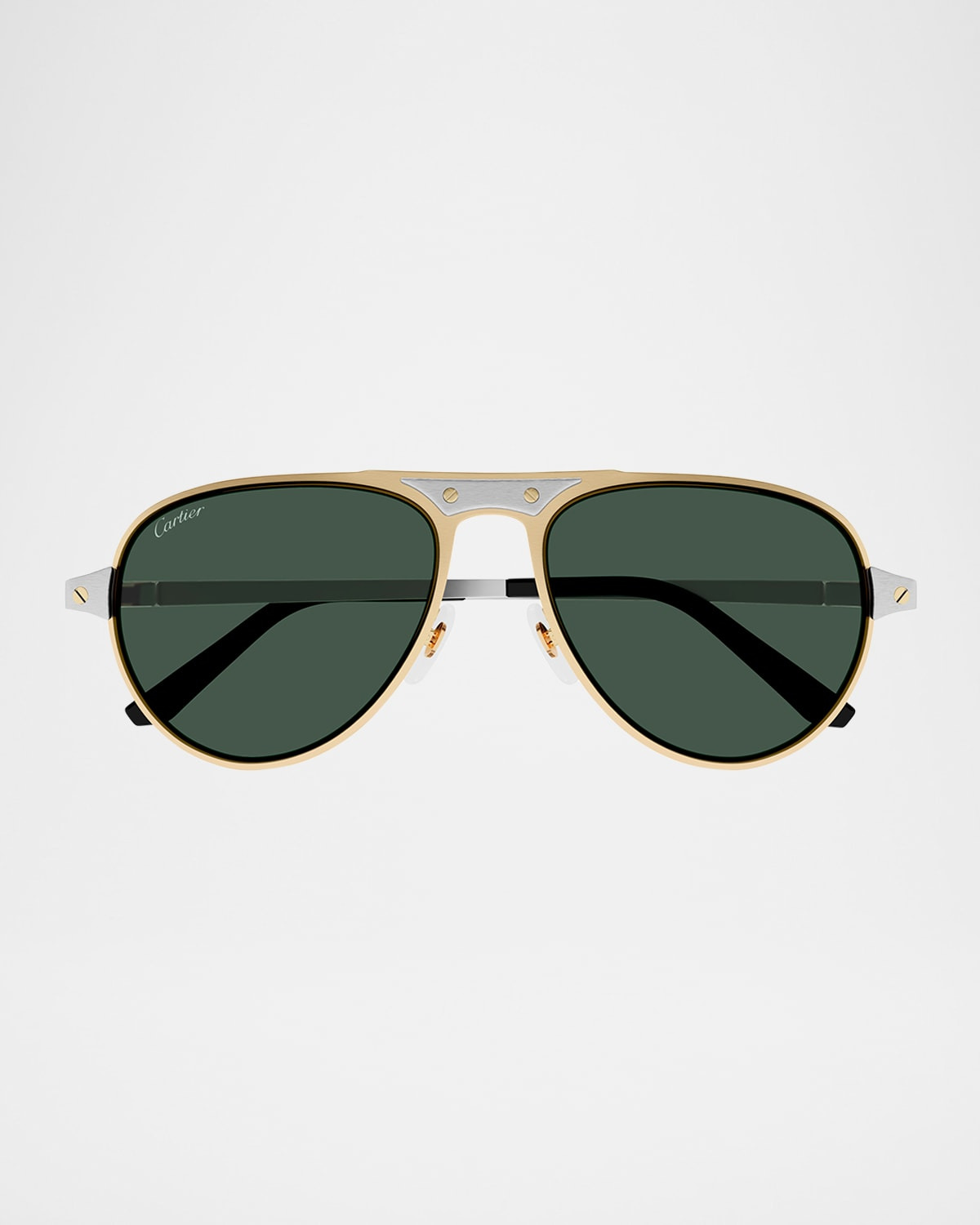- Cartier "CT0533SM" aviator sunglasses in two-tone metal - Lens/bridge/temple (in mm): - 58-16-145 - Solid-color lenses - Right lens logo script - Adjustable nose pads - Engraved logo on the temples - Curved, capped temple tips - Metal - 100% UVA/UVB protection - Made in France - Proposition 65 warning for California residents
