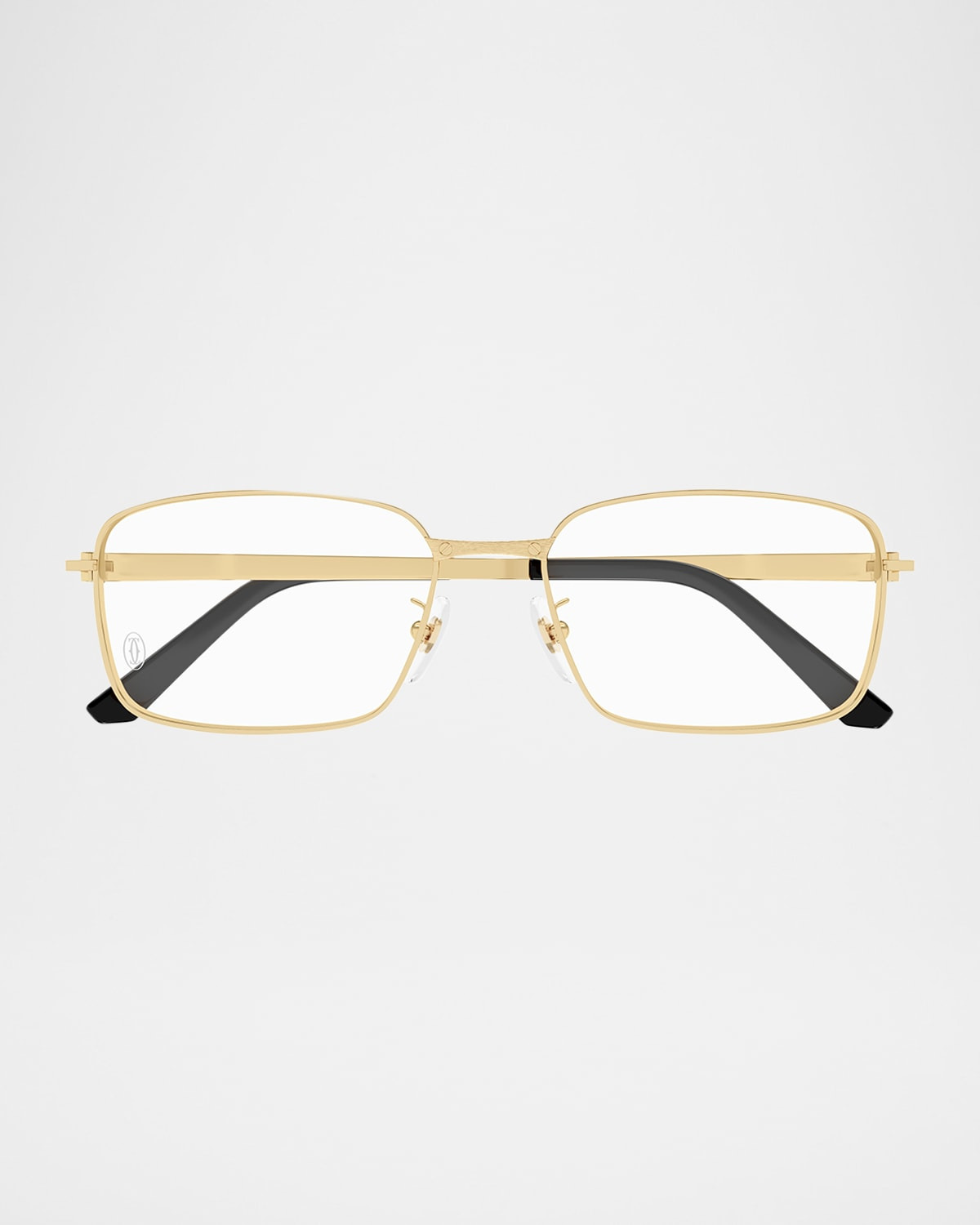 - Cartier "CT0555OA" rectangular optical frames in luxurious gold-tone titanium - Lens/bridge/temple (in mm): - 55-17-145 - Clear, non-optical demo lenses (replacement recommended) - Adjustable nose pads - Engraved logo on the temples - Thin arms - Curved, capped temple tips - Titanium - Made in Japan - Proposition 65 warning for California residents