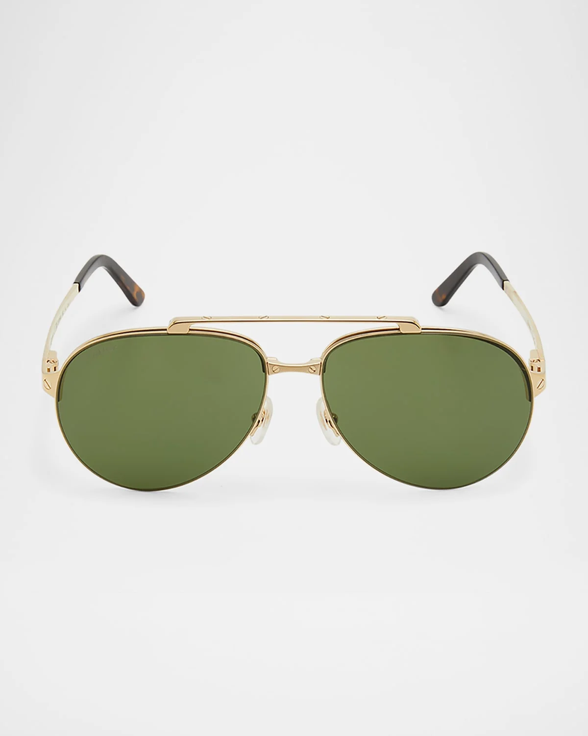 - Cartier aviator sunglasses feature gold-tone hardware with studs - Solid-colored lenses; etched logo at right lens - Thin, full-rim frames - Double nose bridge - Adjustable nose pads - Engraved logo at temples - Thin arms; curved capped temple tips - Metal - 100% UVA/UVB protection - Made in France - Proposition 65 warning for California residents